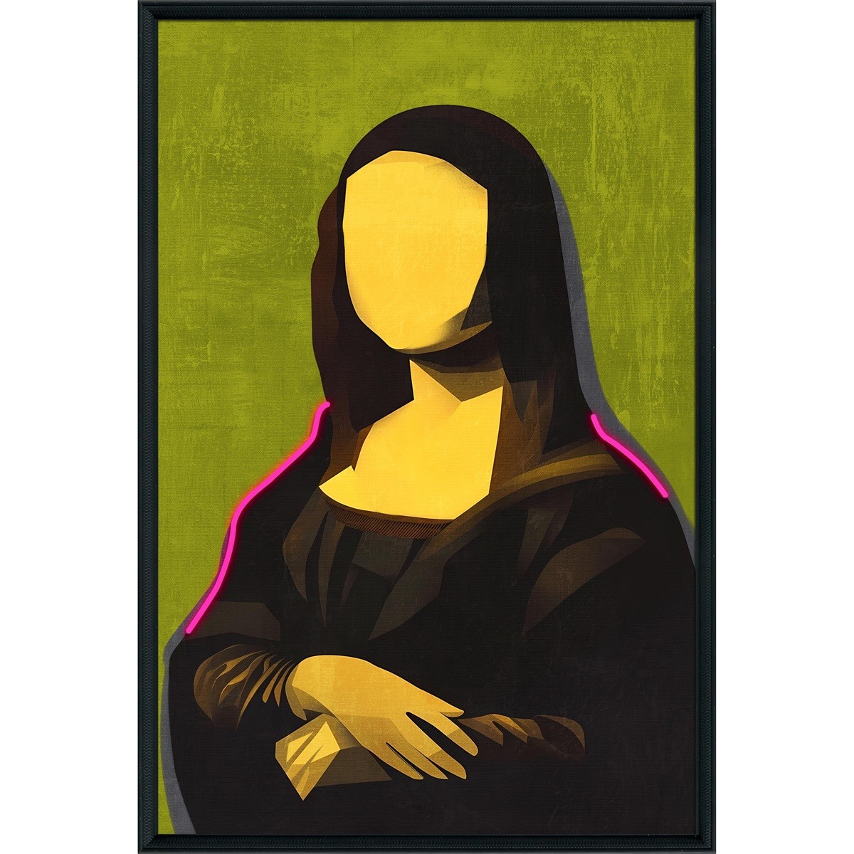 Dit helemaal nieuwe en supermoderne glasschilderij is een ware blikvanger voor aan jouw muur. Het toont een abstracte, gezichtsloze weergave van de iconische Mona Lisa in opvallende gele, zwarte en groene tinten. Wat dit kunstwerk echt uniek maakt, is de toevoeging van roze ledverlichting langs de contouren van haar figuur. Deze verlichting is eenvoudig te bedienen door middel van batterijen of een schakelaar. Dit hoge glasschilderij staat prachtig in een strak en eigentijds interieur, maar geeft ook jouw kantoor of bedrijfsruimte een zeer smaakvolle en artistieke uitstraling.