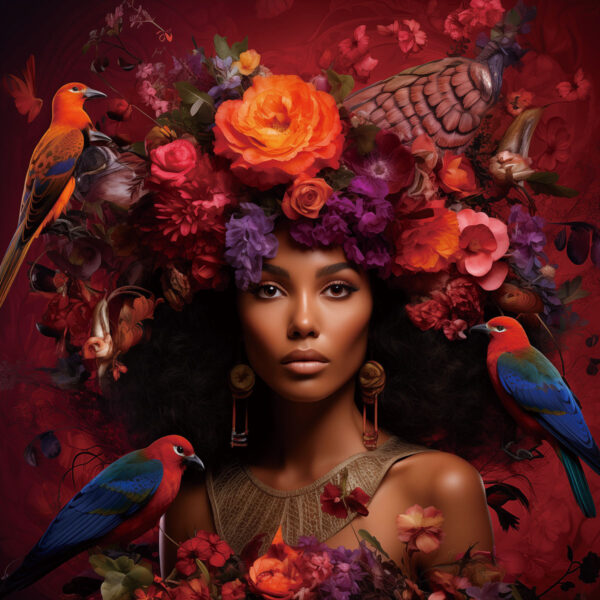 Dit is een vierkante glasplaat met een vrouw omringd door bloemen en vogeltjes in warme kleuren.