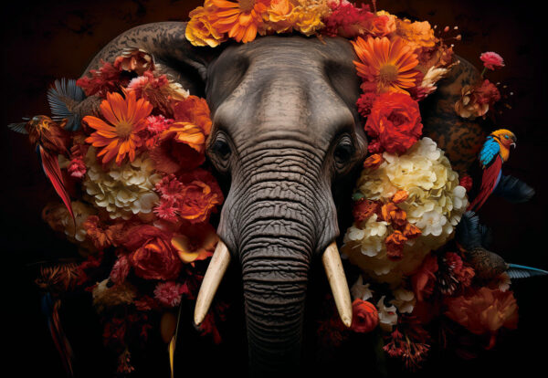 Dit is een zeer grote glasplaat met een olifantenkop met vele bloemen in vele kleuren.