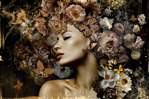 Dit is een zeer grote glasplaat met mooi weergegeven vrouw die omringd is met bloemen en vlinders in rustige sfeer kleuren.