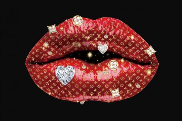 Deze zeer grote glasplaat met knalrode lippen met een Louie Viton effect.