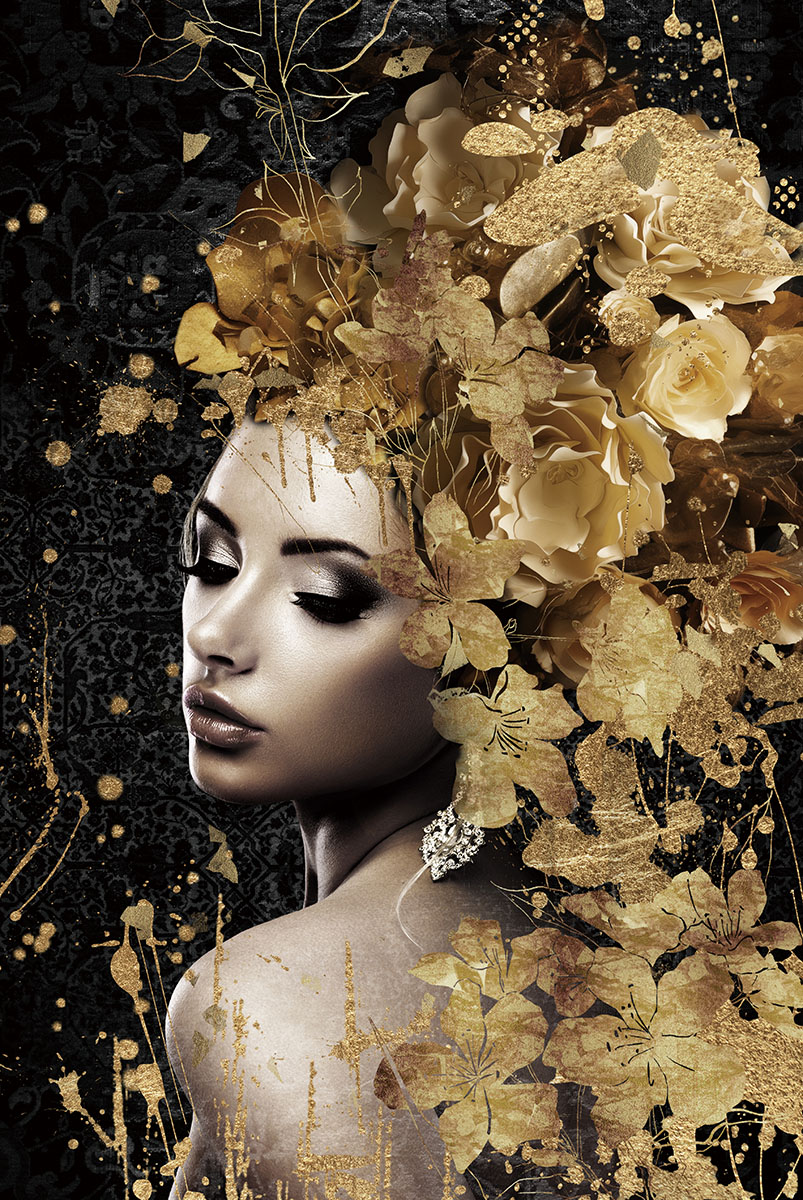 Glasschilderij Vrouw met gouden bloemenstaart 80x120cm