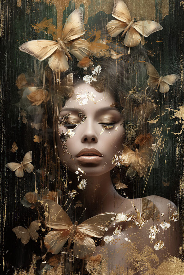 Glasschilderij Vrouw met gouden vlinders 80x120cm