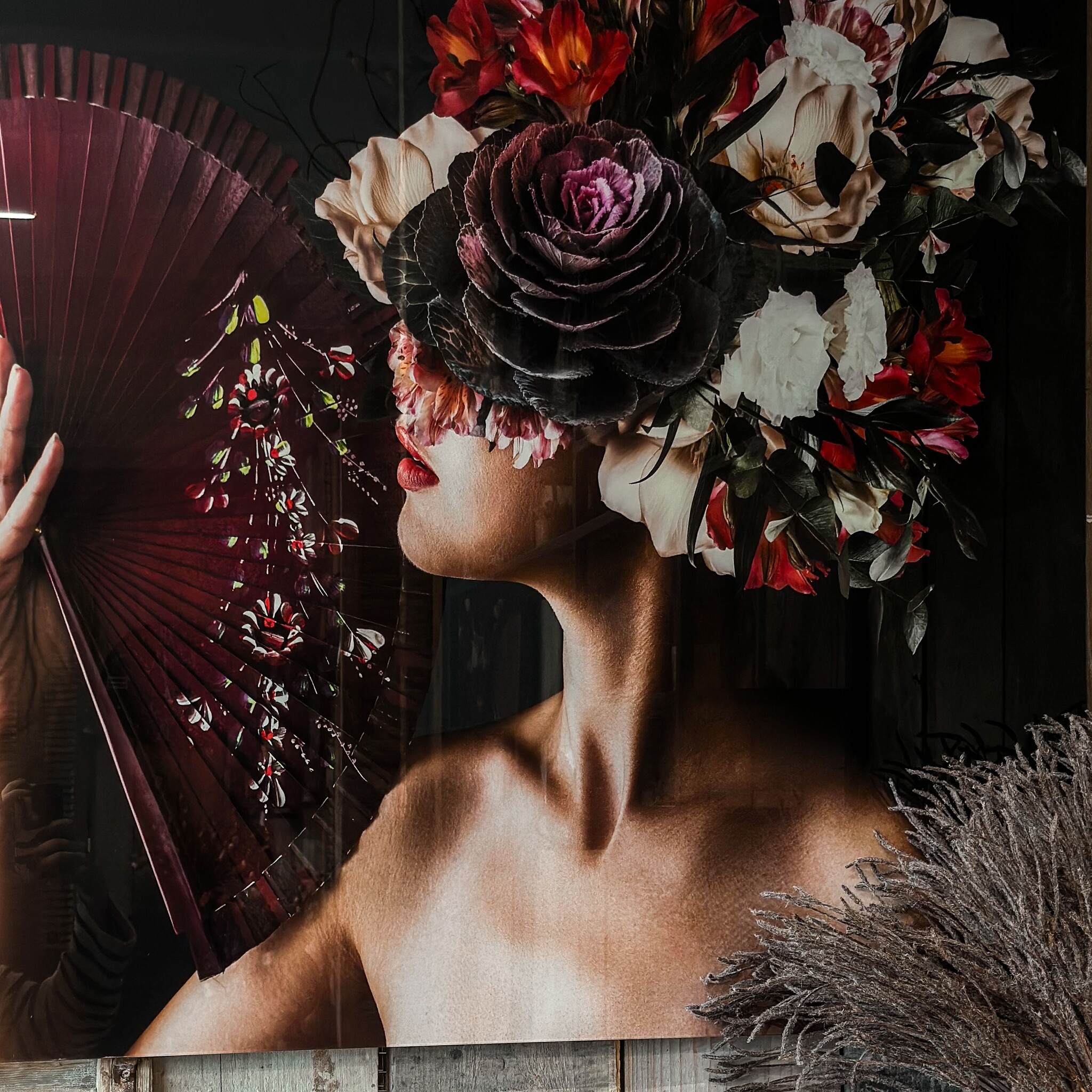 Glasschilderij Vrouw met waaier zijaanzicht 100x100cm.
