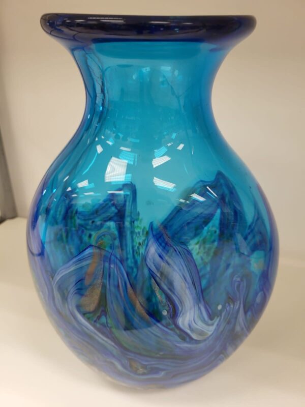 Deze blauw getinte siervaas is gemaakt op de ouderwetse ambachtelijke glasblaas- techniek. Bijzonder is hoe op de traditionele manier uit verschillende kleuren glas dit prachtige model bloemenvaas is verkregen.