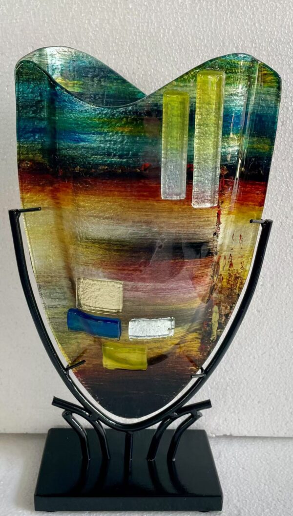Dit model glasvaas op metalen houder is een geschikt model als u op zoek bent naar een spetterende en kleurrijke toevoeging in uw huis met moderne stijl en klasse. Ook voor op kantoor zorgt dit product voor een échte eyecatcher omdat deze glasvaas uniek is in zijn soort en kleuren in New Age stijl.
