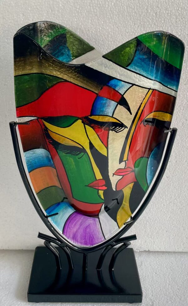Dit model glasvaas op metalen houder is een geschikt model als u op zoek bent naar een spetterende en kleurrijke toevoeging in uw huis met moderne stijl en klasse. Ook voor op kantoor zorgt dit product voor een échte eyecatcher omdat deze glasvaas uniek is in zijn soort en kleuren in New Age stijl.