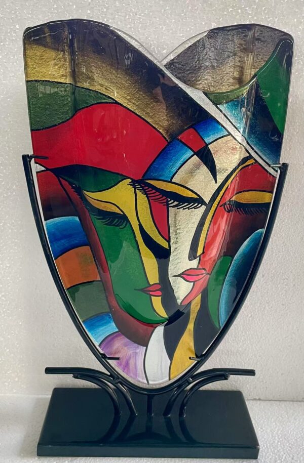 Dit model glasvaas op metalen houder is een geschikt model als u op zoek bent naar een spetterende en kleurrijke toevoeging in uw huis met moderne stijl en klasse. Ook voor op kantoor zorgt dit product voor een échte eyecatcher omdat deze glasvaas uniek is in zijn soort en kleuren in New Age stijl.