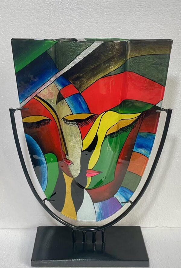 Dit model glasvaas op metalen houder is een geschikt model als u op zoek bent naar een spetterende en kleurrijke toevoeging in uw huis met moderne stijl en klasse. Ook voor op kantoor zorgt dit product voor een échte eyecatcher omdat deze glasvaas uniek is in zijn soort en kleuren in New Age stijl.