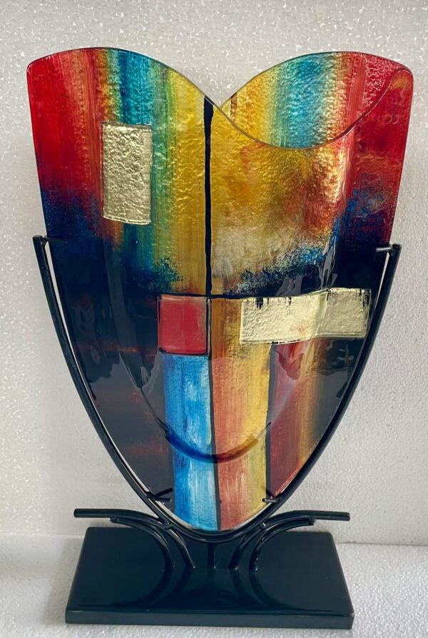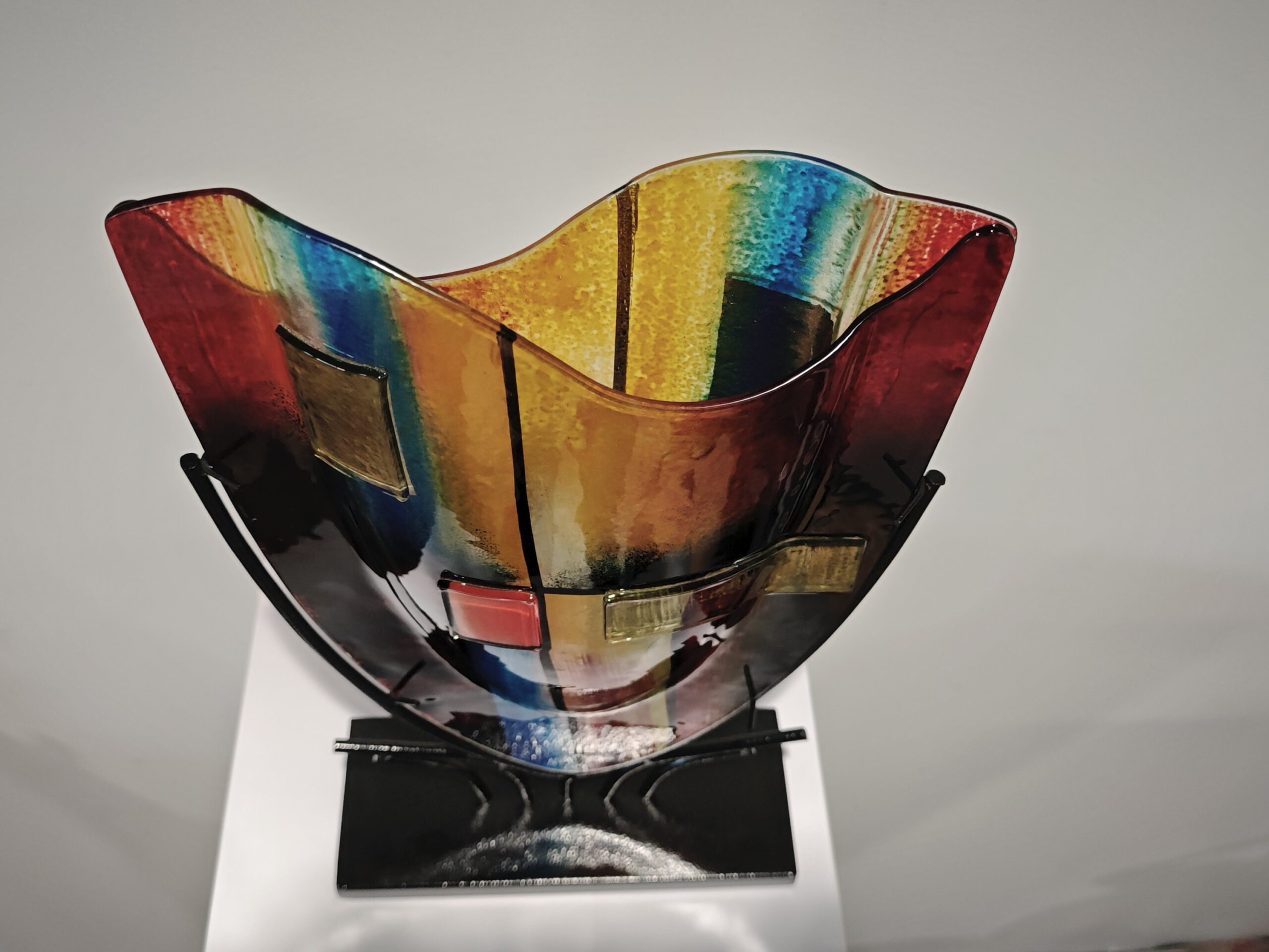 Dit model glasvaas op metalen houder is een geschikt model als u op zoek bent naar een spetterende en kleurrijke toevoeging in uw huis met moderne stijl en klasse. Ook voor op kantoor zorgt dit product voor een échte eyecatcher omdat deze glasvaas uniek is in zijn soort en kleuren in New Age stijl.