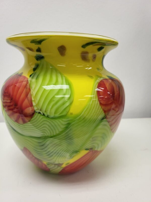 Deze geel/groene siervaas is gemaakt op de ouderwetse ambachtelijke glasblaas- techniek. Bijzonder is hoe op de traditionele manier uit verschillende kleuren glas dit prachtige model bloemenvaas is verkregen.
