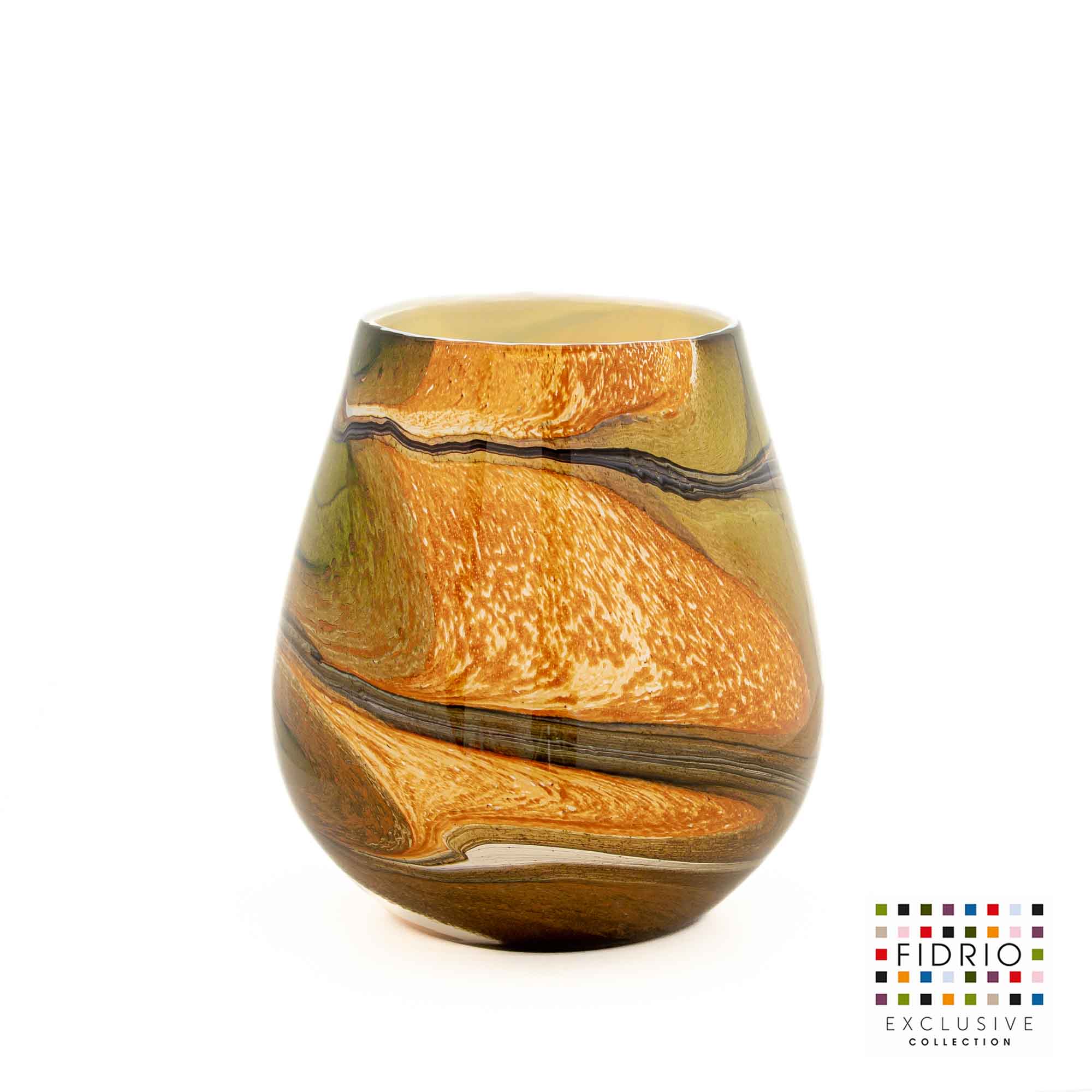 Alle glasvazen van Fidrio zijn handmatig gemaakt op de traditionele, ambachtelijke wijze. Het bewerkbare super hete glas wordt in een houten mal geblazen, waarbij de mal als basisvorm dient, maar de kleurschakeringen en daarmee ook de uitstraling zullen bij elke vaas anders zijn. De opgegeven maten zijn altijd Circa maten.