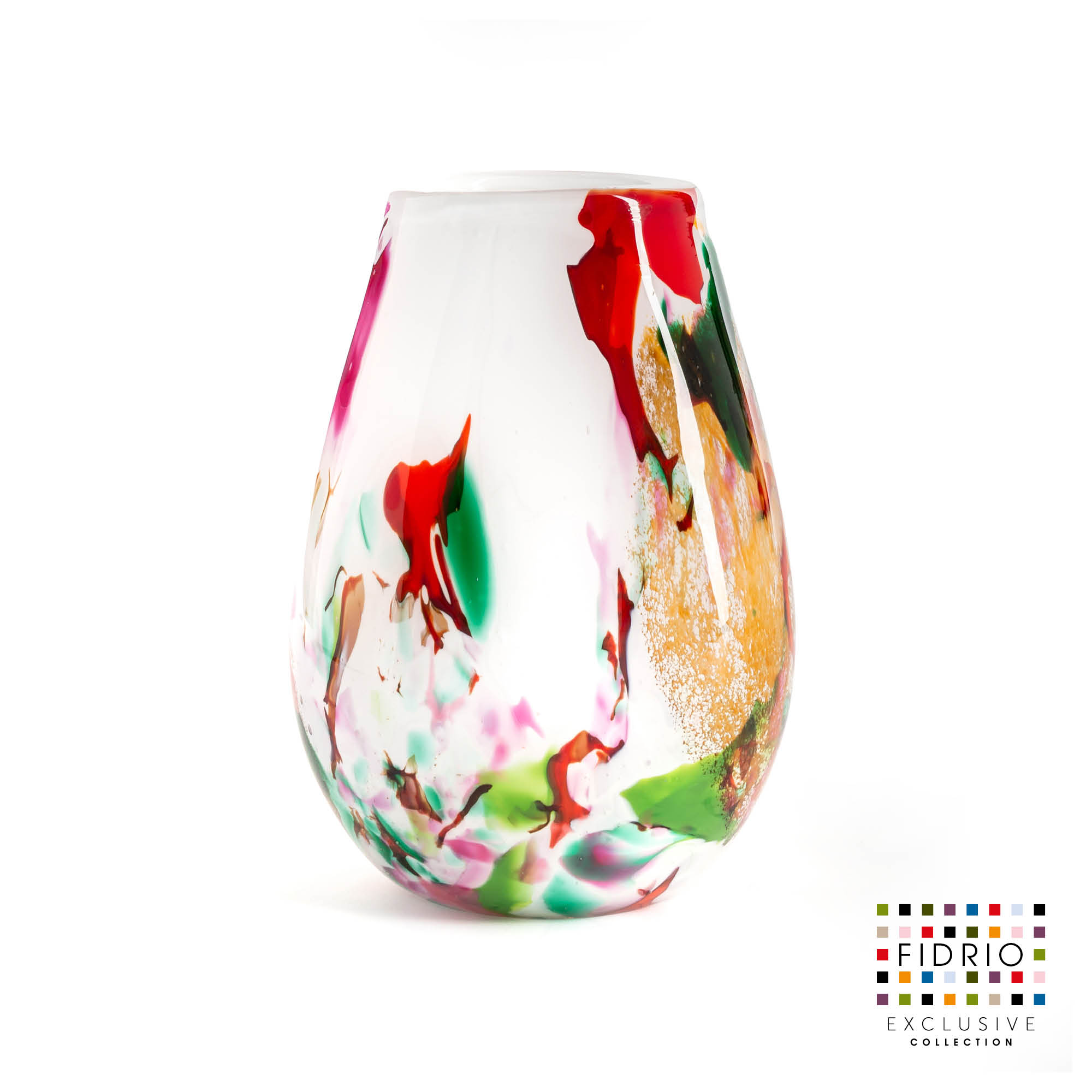 Alle glasvazen van Fidrio zijn handmatig gemaakt op de traditionele, ambachtelijke wijze. Het bewerkbare super hete glas wordt in een houten mal geblazen, waarbij de mal als basisvorm dient, maar de kleurschakeringen en daarmee ook de uitstraling zullen bij elke vaas anders zijn. De opgegeven maten zijn altijd Circa maten.