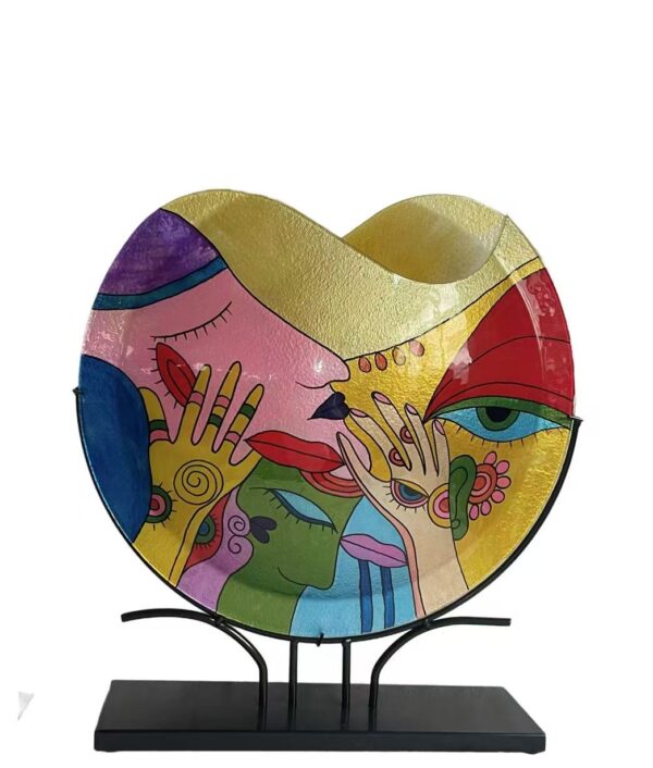 Dit prachtige model uit de serie Giulia glaswerk met vazen en schalen is in felle kleuren en met abstract weergegeven gezichten een ware aankleding voor uw huis.