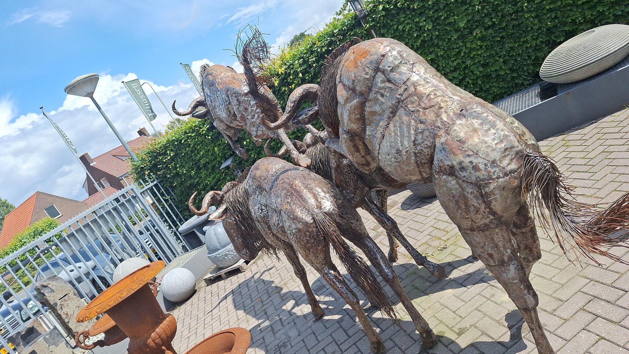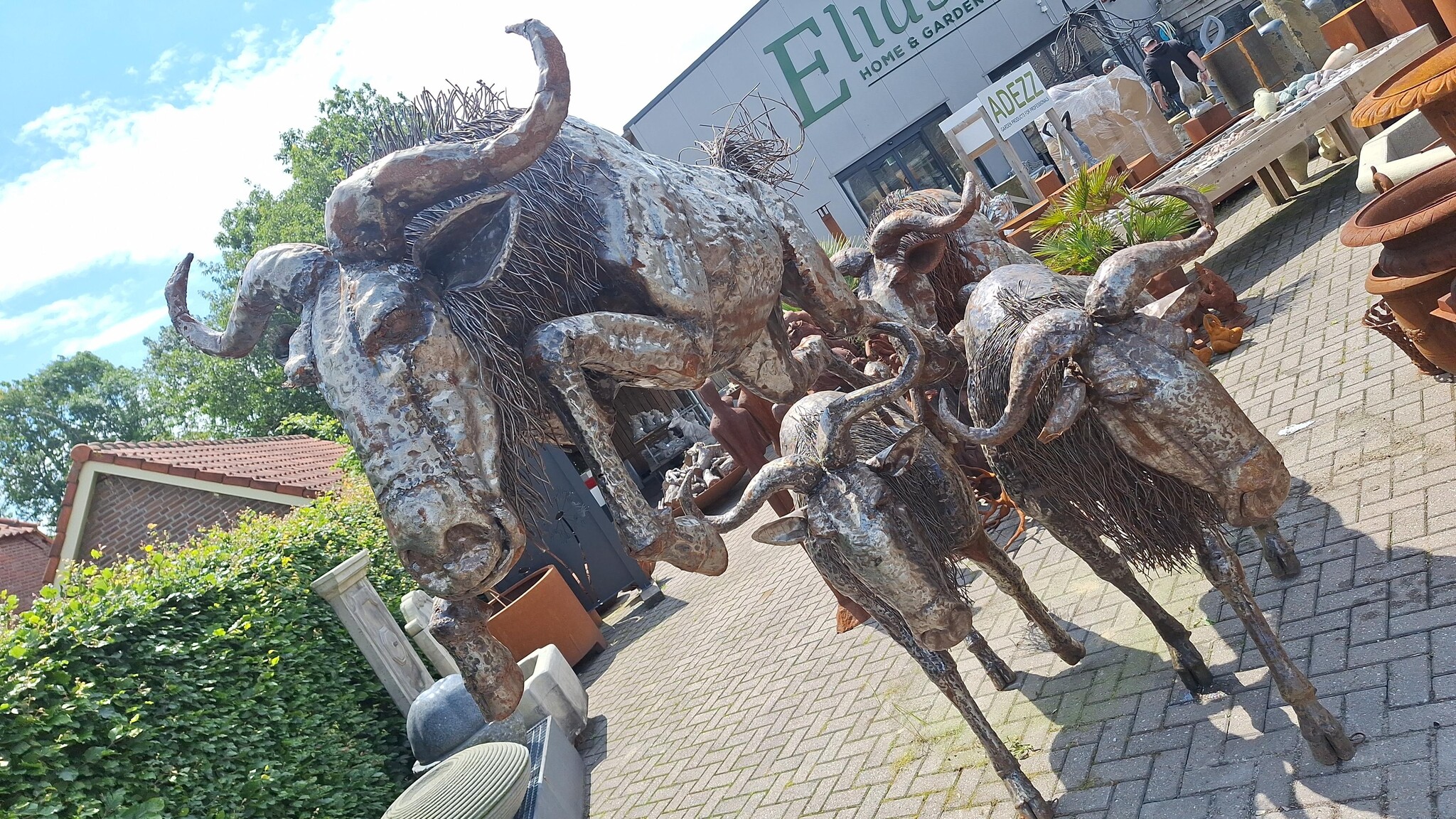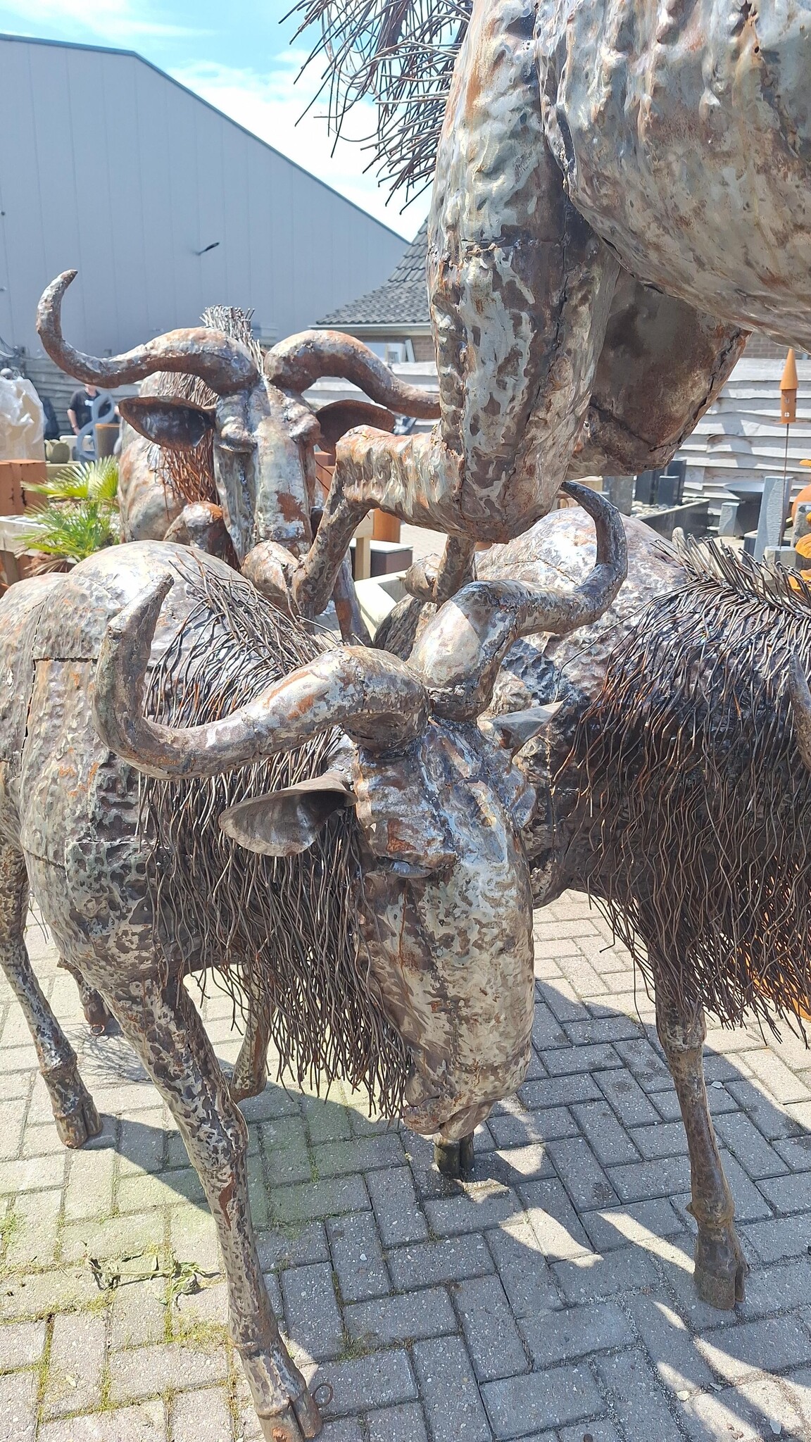 Het zijn echte kunstenaars, die dit beeld van een levensgrote kudde met 4 gnoe’s gemaakt hebben. Als je dit beeld lang bekijkt ga je beseffen hoeveel werk het is om een kunstwerk als dit te maken. Kloppen, buigen, lassen, meten, het is echt een gigantisch werk. Wilt u iets unieks in uw tuin of bij uw bedrijf, dan bent u er zeker van dat dit model zeer zeldzaam is en niet zomaar te koop is. !!
