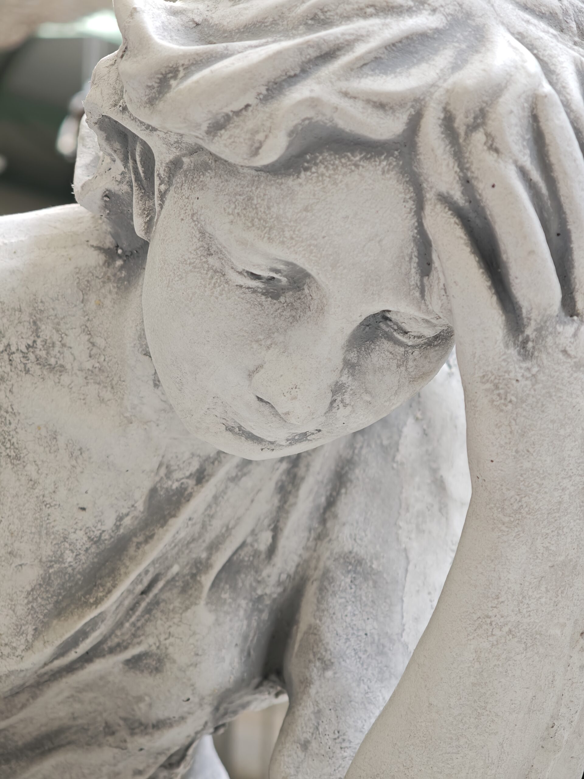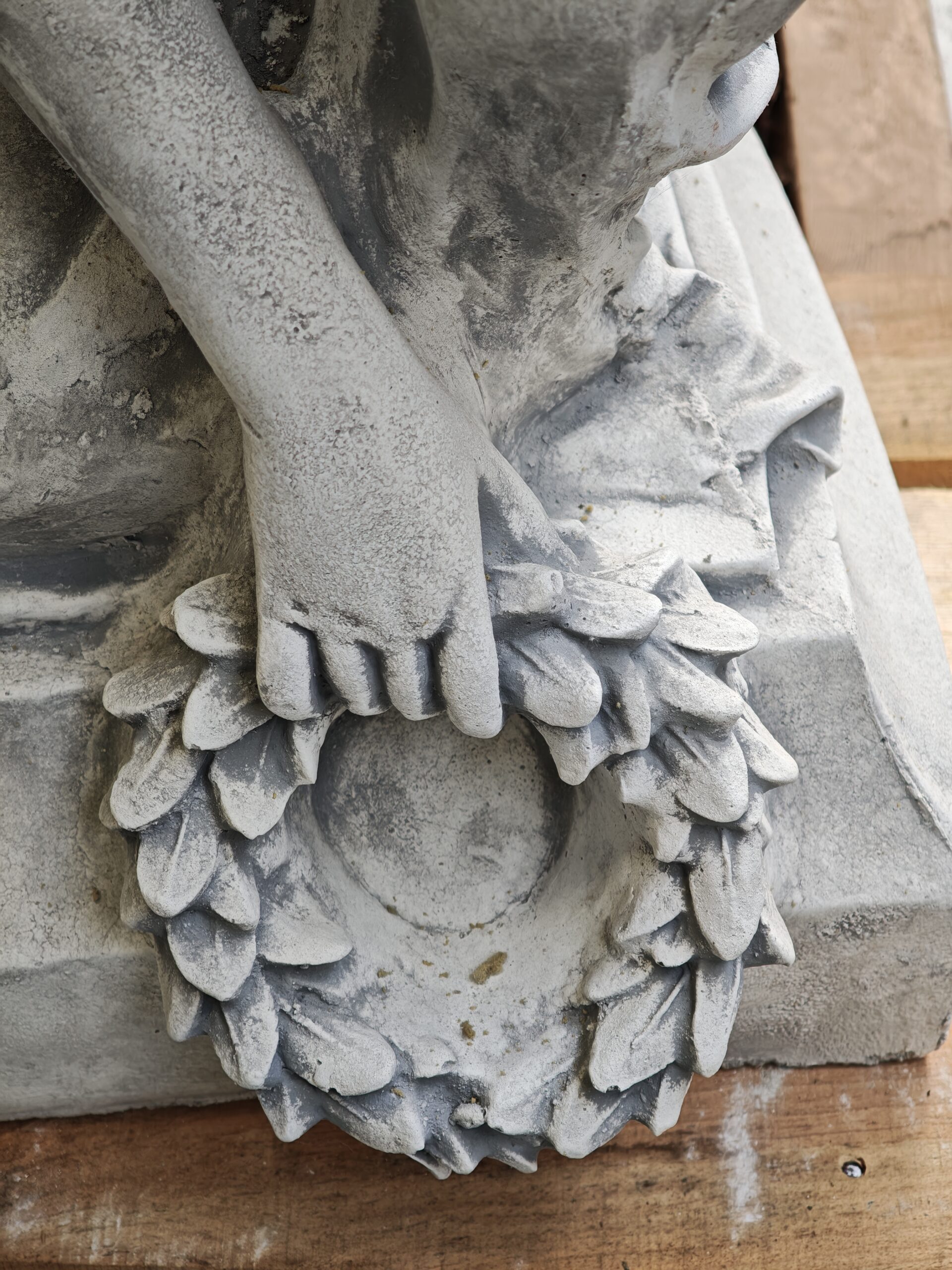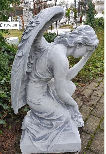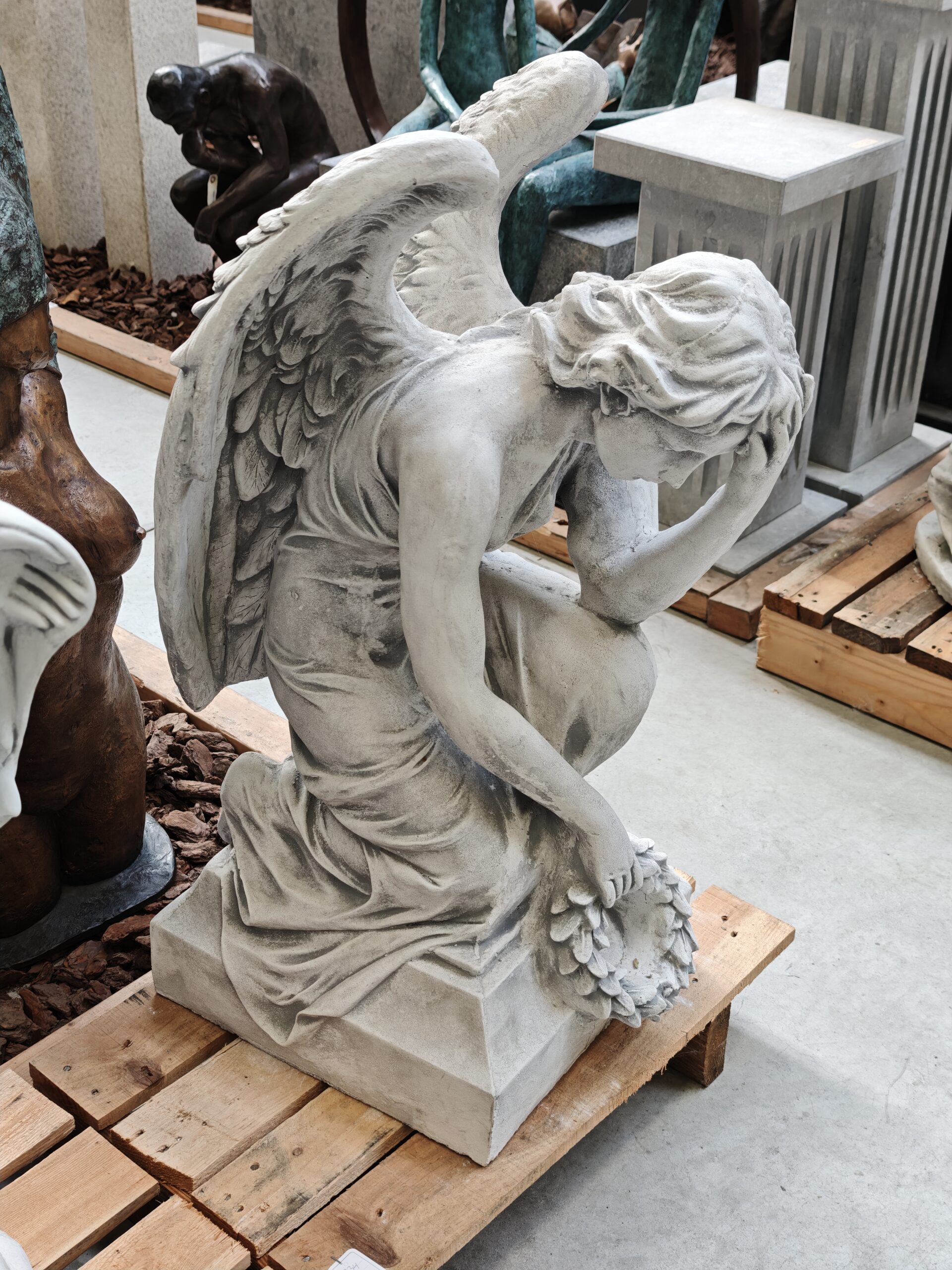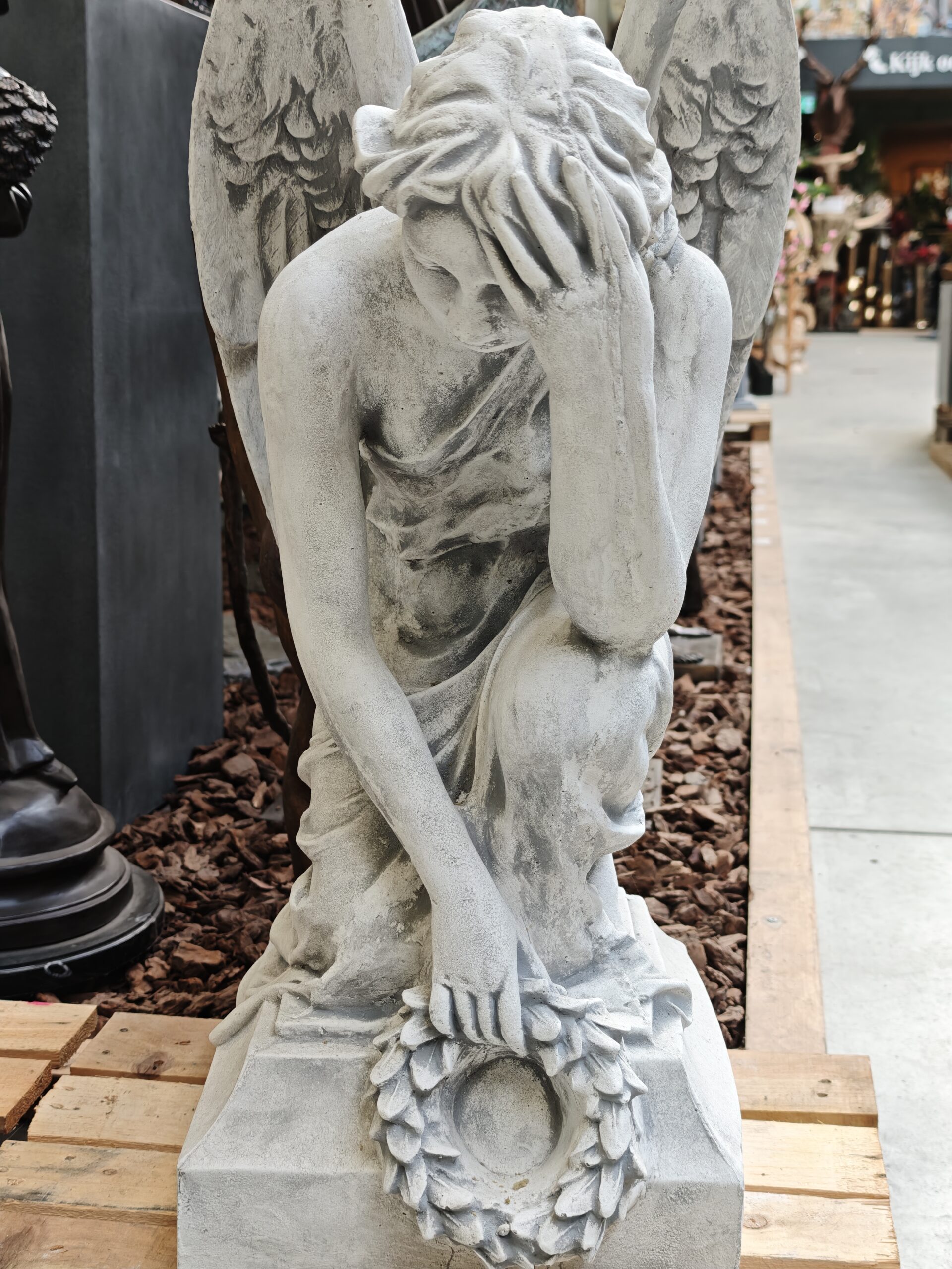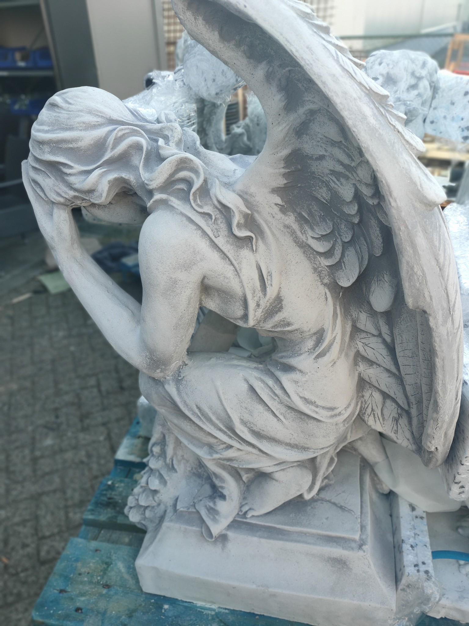 Prachtig vormgegeven beeld van een grote engel beeld op een knie, met hand tegen hoofd, van hoogwaardige gietsteen, grijs ingewassen. De hoogte is 81cm, 95kg zwaar.