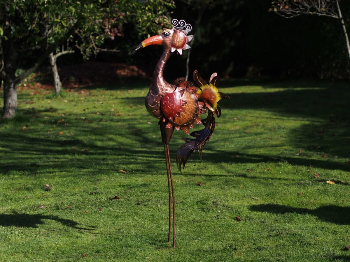 Schitterend afgewerkte metalen figuur van een grote kleurrijke vogel. Een sieraad in huis of tuin en mooi om cadeau te doen. Helemaal met de hand gemaakt en geverfd en heeft maar liefst een hoogte van 143 cm.