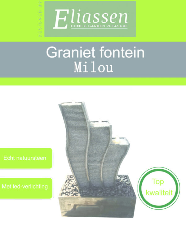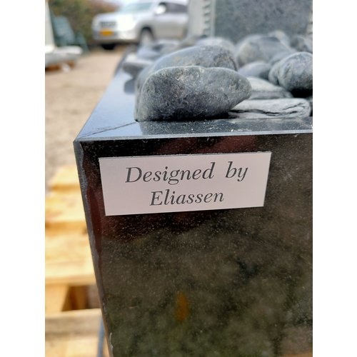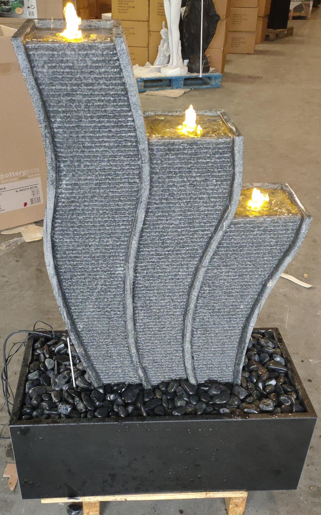 Een prachtig hoge strakke moderne muurfontein voor in uw tuin of op het terras, in eigen beheer ontwikkeld en nergens anders te koop. De waterbak is gemaakt van effen pikzwart gepolijst graniet, de gekromde waterzuilen, waar het water aan de voorzijde vanaf loopt, zijn van grijs gepolijst graniet die deels ingezaagd zijn, voor een zeer mooie schittering op het reliëf, zeker in het donker wanneer er een spot op gericht wordt.