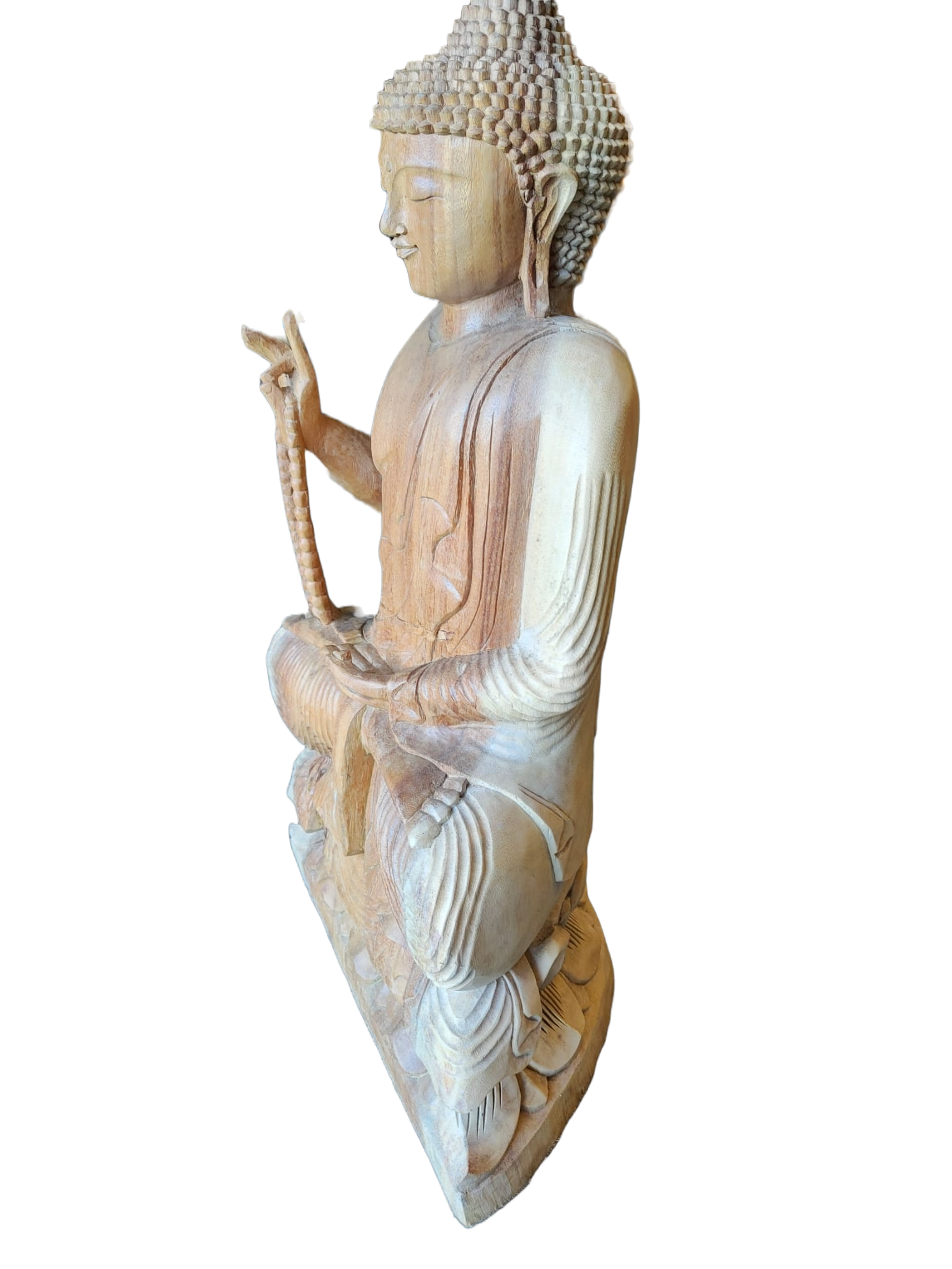 Houdt u van hand gemaakte producten? Dan deze handgesneden Boeddha die een ketting of gebedsnoer vasthoudt u zeker aanspreken.