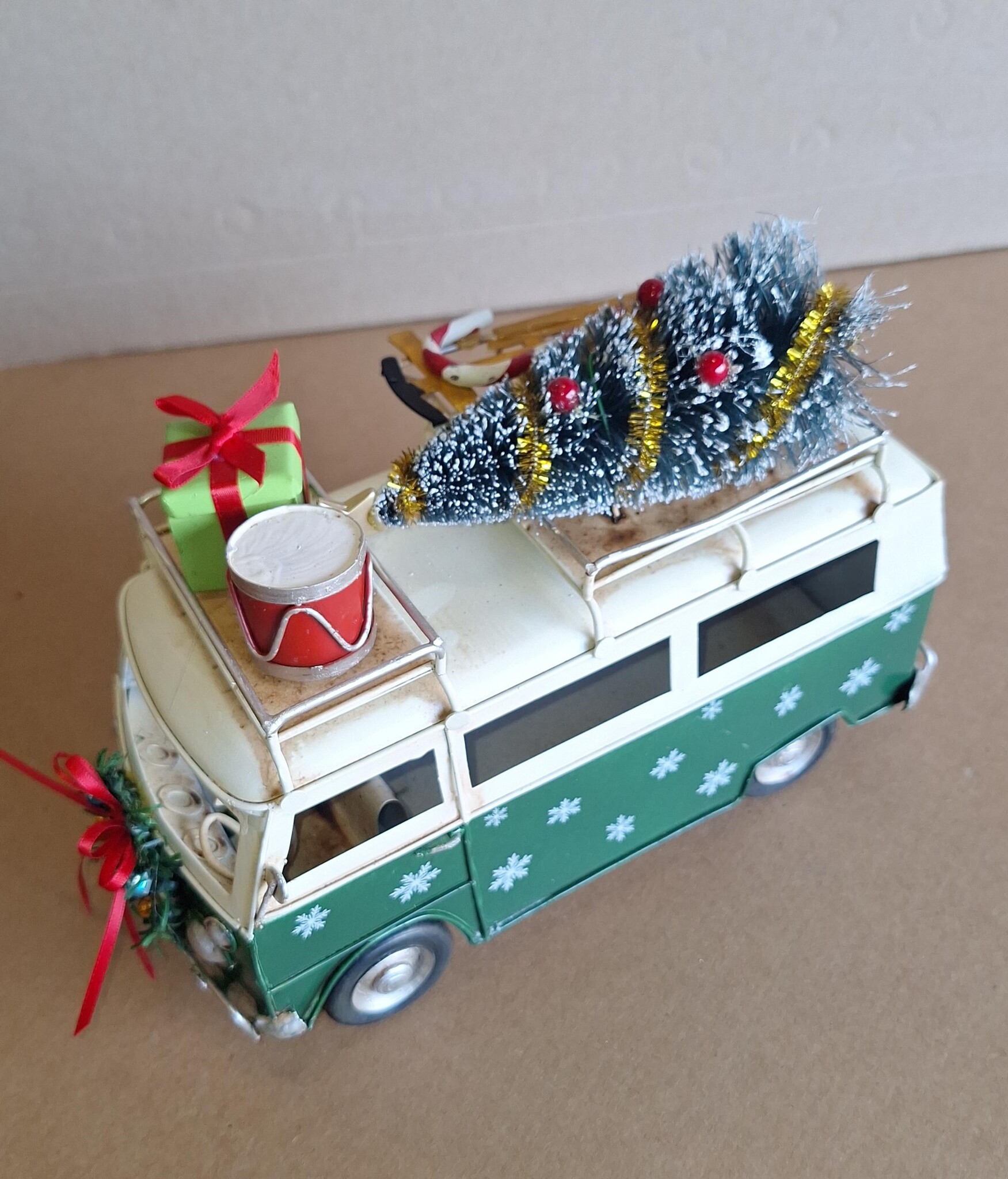 Prachtig met de hand gemaakt model van een groene vw bus in kerstsfeer, geladen met kerst cadeau’s.