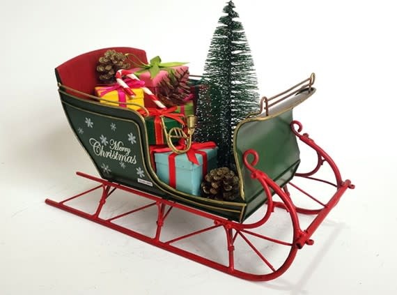 Prachtig met de hand gemaakt model van een rode metalen arreslee, geladen met kerst cadeau’s.