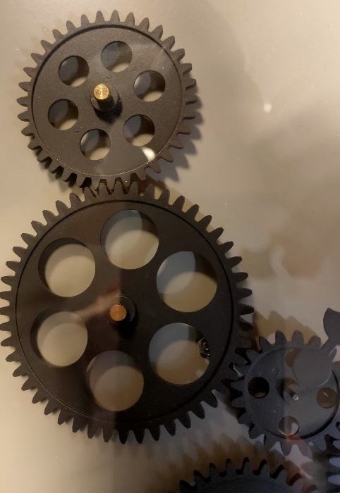 Klok is old gold van kleur en tandwielkast idem. Deze muurklok is voorzien van vele tandwielen, die rustig draaien, hetgeen voor een speels effect geeft, je kunt uren kijken naar dat draaiende spel.