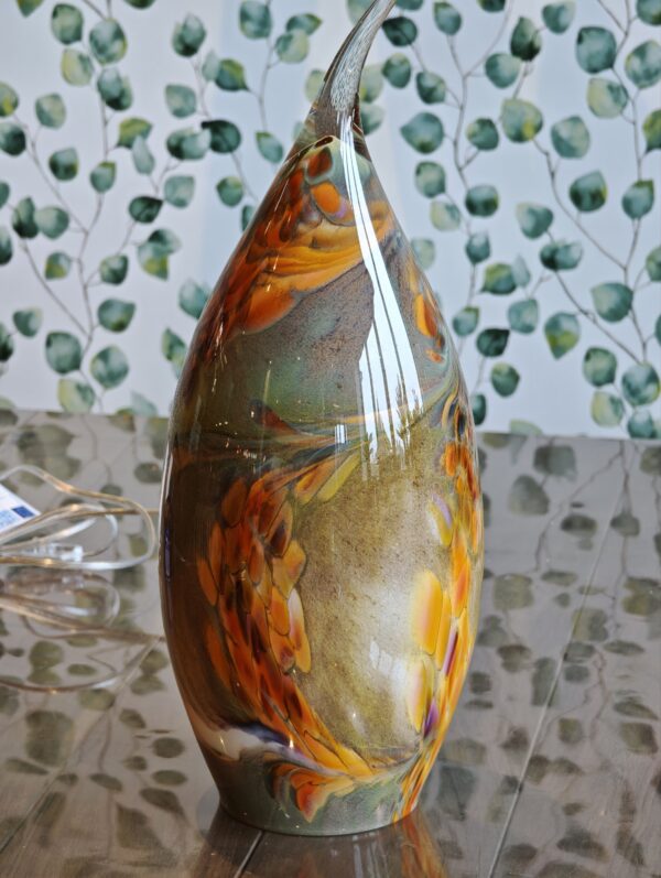 Deze elegante glazen lamp van 45 cm hoog heeft een unieke, spits toelopende vorm en is uitgevoerd in warme terra- en bruintinten. Het is een sfeervol handgemaakt object met organische patronen die elk exemplaar uniek maken, wat zorgt voor een warme en exclusieve uitstraling in jouw interieur.
