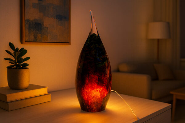 Deze lamp van dik glas zal een aanwinst zijn voor uw huis of bedrijf. Het is een uniek stuk glaswerk, omdat dit model mond geblazen is en daardoor elk exemplaar uniek is qua kleur en vorm. De warme/diepe kleur genereert een geweldig mooi licht effect. Aangezien er in deze glaslampen geen hitte mag ontstaan, dient u in deze lampen ledlampen te gebruiken, omdat dit type lamp nauwelijks warmte genereert. Deze lamp van glas is voorzien van een E27 fitting, met 1,5 mtr snoer met schakelaar.