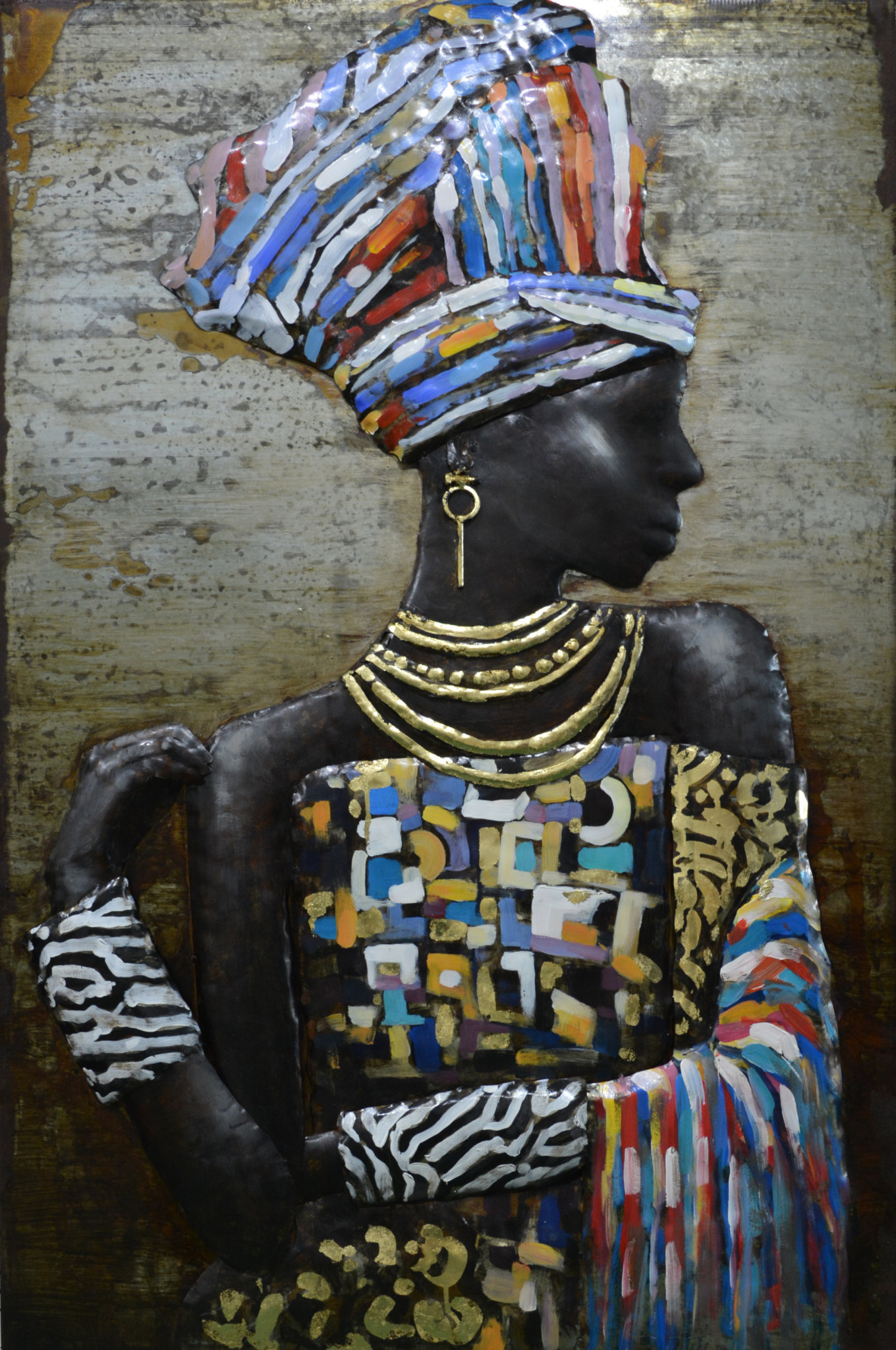 Metalen 3d schilderij, met de afbeelding van een Afrikaanse vrouw, subliem gemaakt van losse delen metaal, die allemaal met de hand aan elkaar gelast zijn, voor een optimaal 3d effect te verkrijgen. Een prachtig stuk muurdecoratie voor in huis, buiten onder een afdak of in uw bedrijf. Kleuren en algemene uitstraling kan afwijken van de foto aangezien dit hele object door mensen handen gemaakt is.