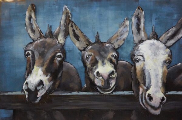 Met dit 3D schilderij kleed u uw interieur volledig aan. Dit metalen 3D schilderij met de afbeelding van een drietal ezeltjes die nieuwsgierig over de rand kijken kunt u bijvoorbeeld in uw huiskamer, woonkamer of slaapkamer hangen om de omgeving verder aan te kleden.