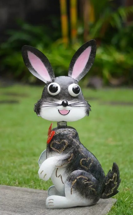 Dit charmante metalen konijn van 30x12x52 centimeter brengt direct een glimlach op je gezicht dankzij het bewegende kopje en het vrolijke rode strikje. Het stevige zwart-witte beeld is prachtig afgewerkt met grote ogen, roze oren en subtiele gouden hartjespatronen op de body. Een speels en hoogwaardig kunstwerk dat een gezellige sfeer toevoegt aan jouw interieur of tuin.