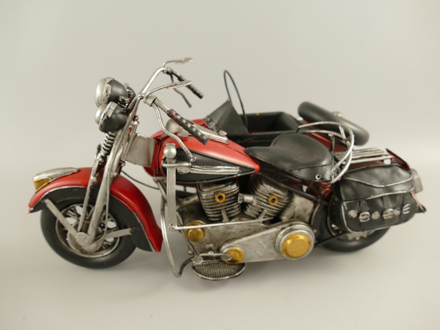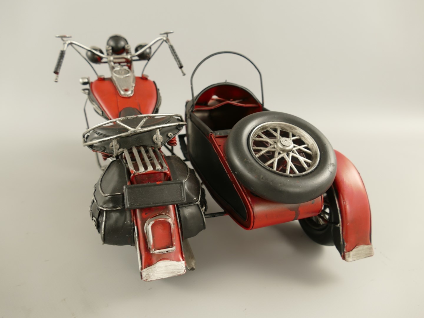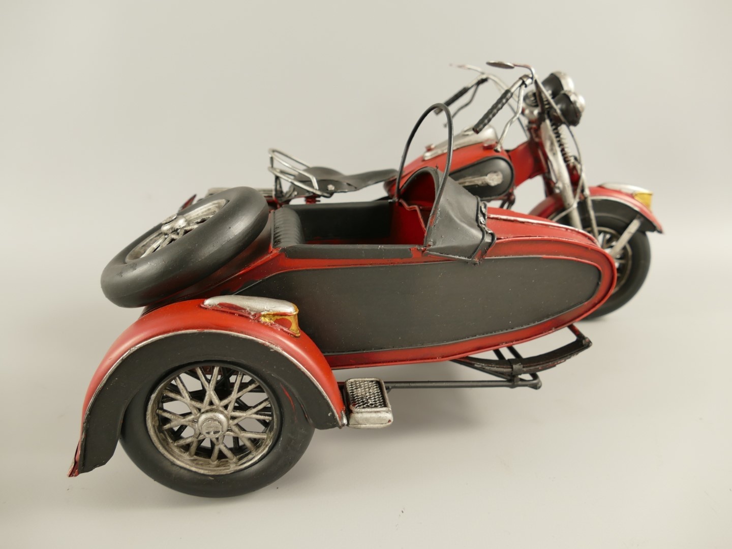 Prachtig met de hand gemaakt model van een rode motor met zijspan.