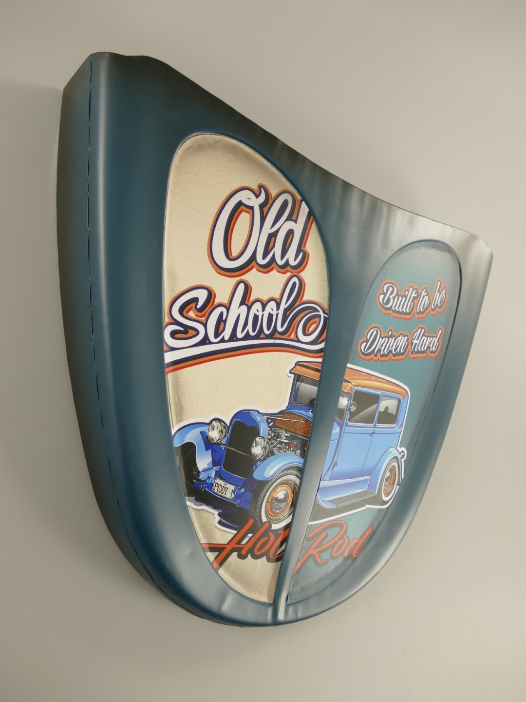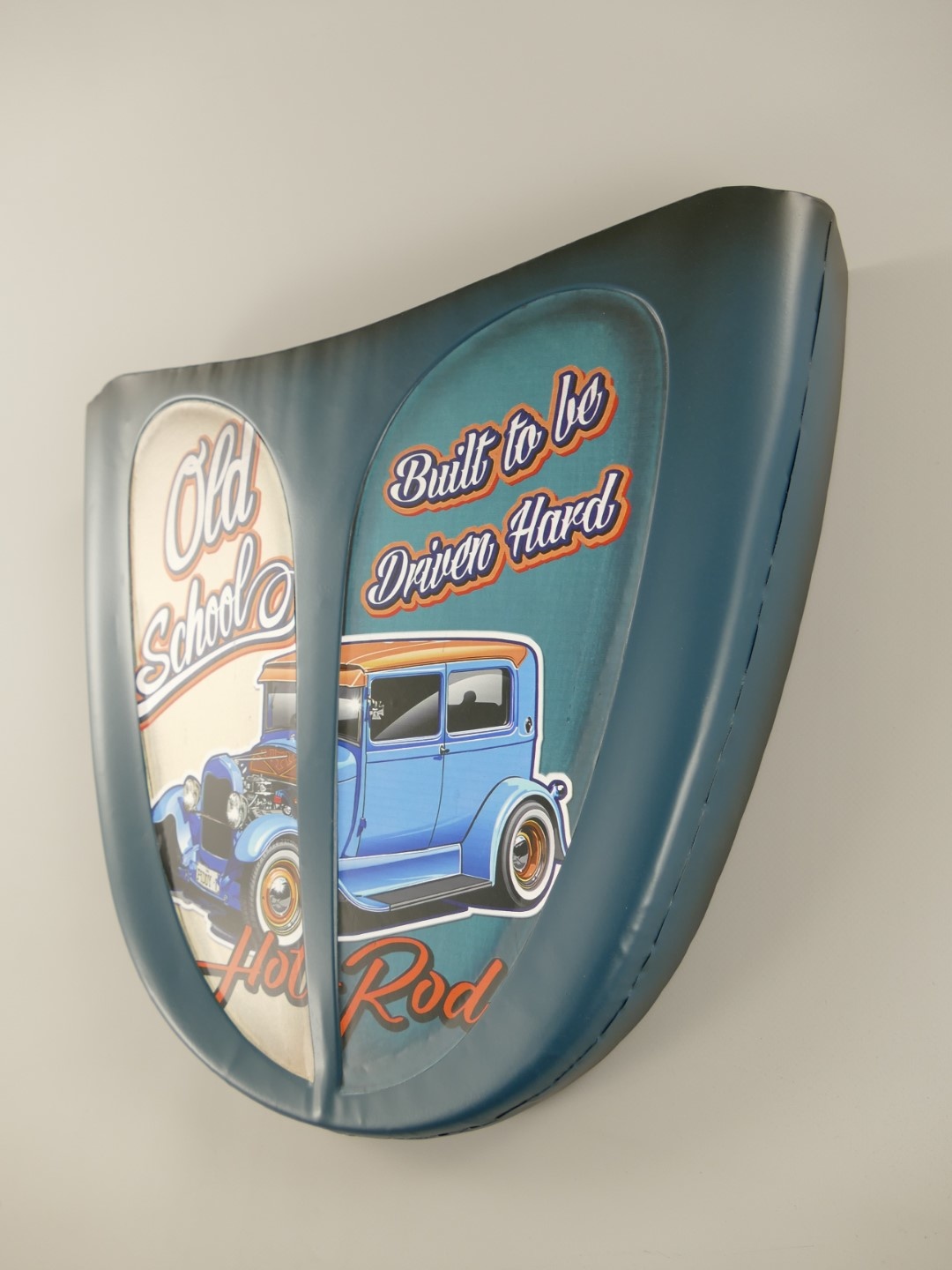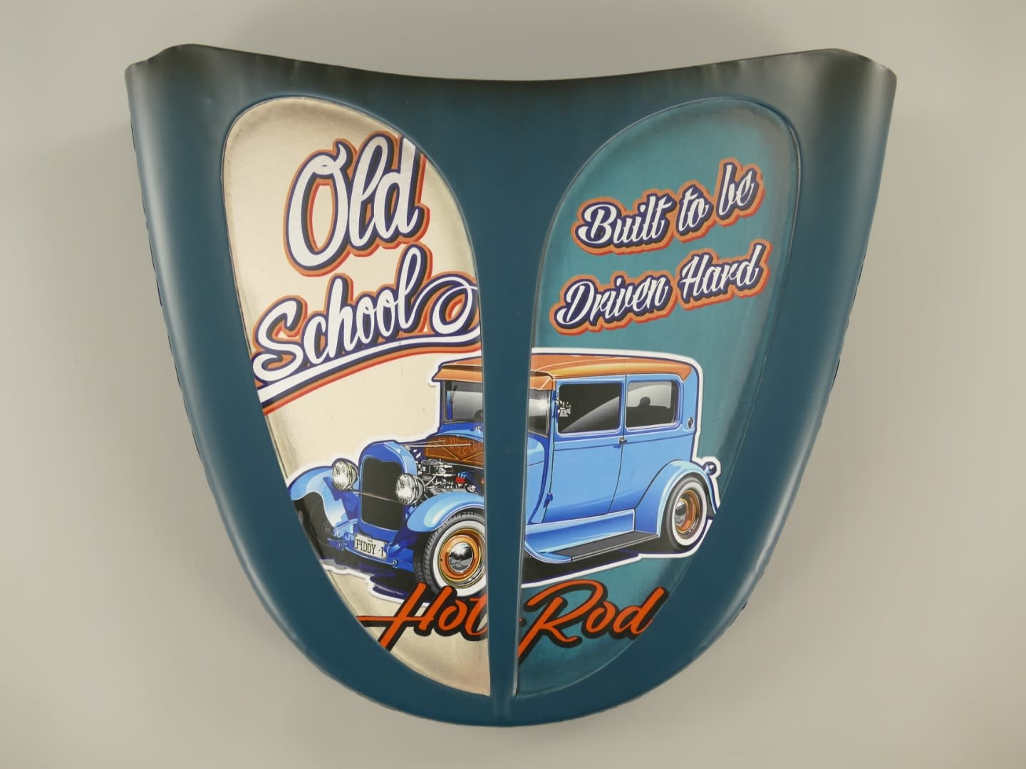 Deze wanddeco is gemaakt van plaatstaal, met een gespoten ondergrond met daarover een transfer en vaak een omgekrulde rand.