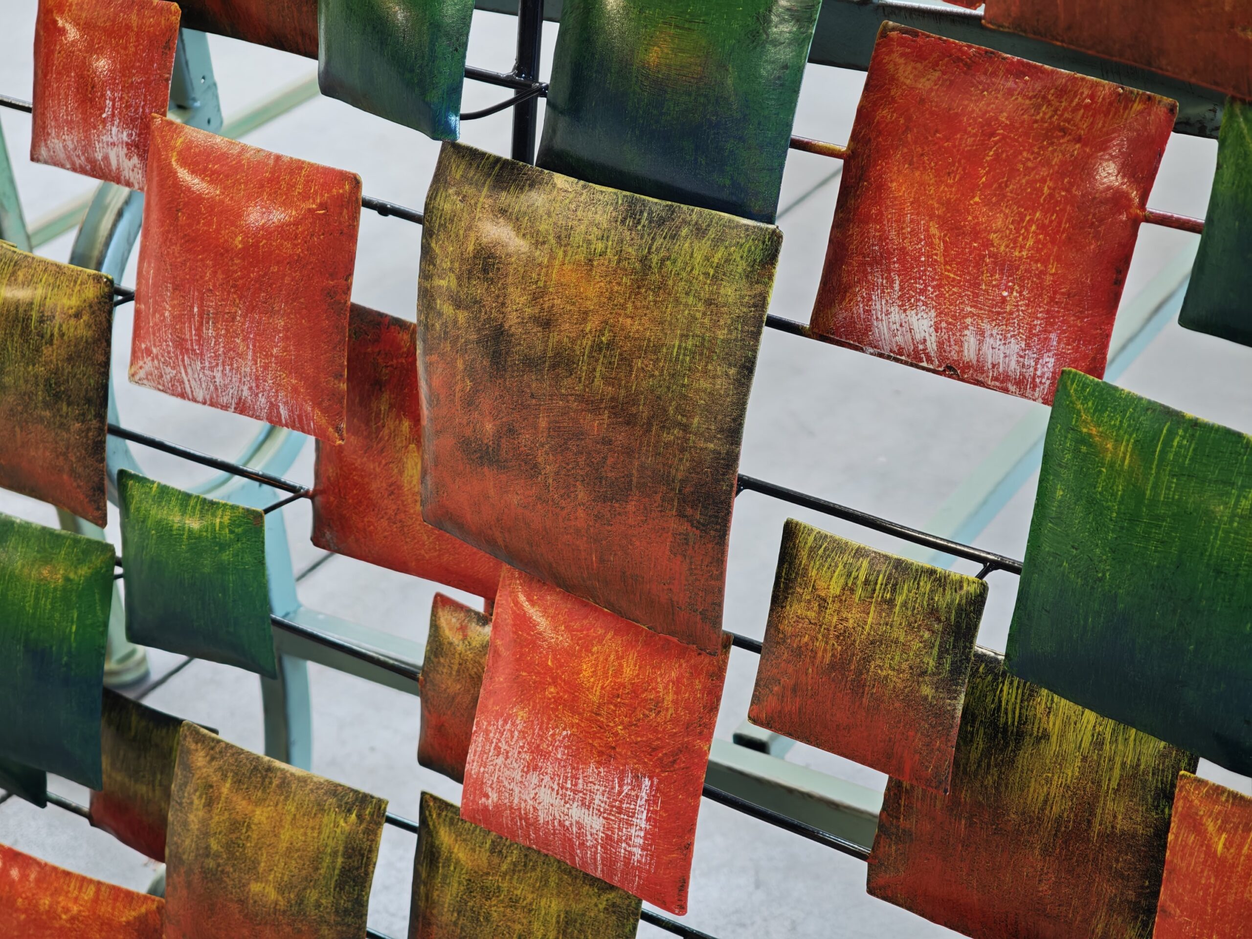 Wilt u uw muur opvrolijken met een kunstwerk dat levendigheid en warmte uitstraalt? De metalen muurdecoratie “Hypnotic Blocks” is een speelse en kleurrijke toevoeging aan elke ruimte. Het kunstwerk bestaat uit een groot aantal metalen vierkanten die in een reliëf op het frame zijn geplaatst. De blokjes zijn uitgevoerd in een prachtige kleurschakering die doet denken aan een zomers veld of herfstkleuren: van fris groen naar warm geel, oranje en diep rood. De kleuren lopen op sommige blokjes subtiel in elkaar over, wat zorgt voor een artistiek en schilderachtig effect.