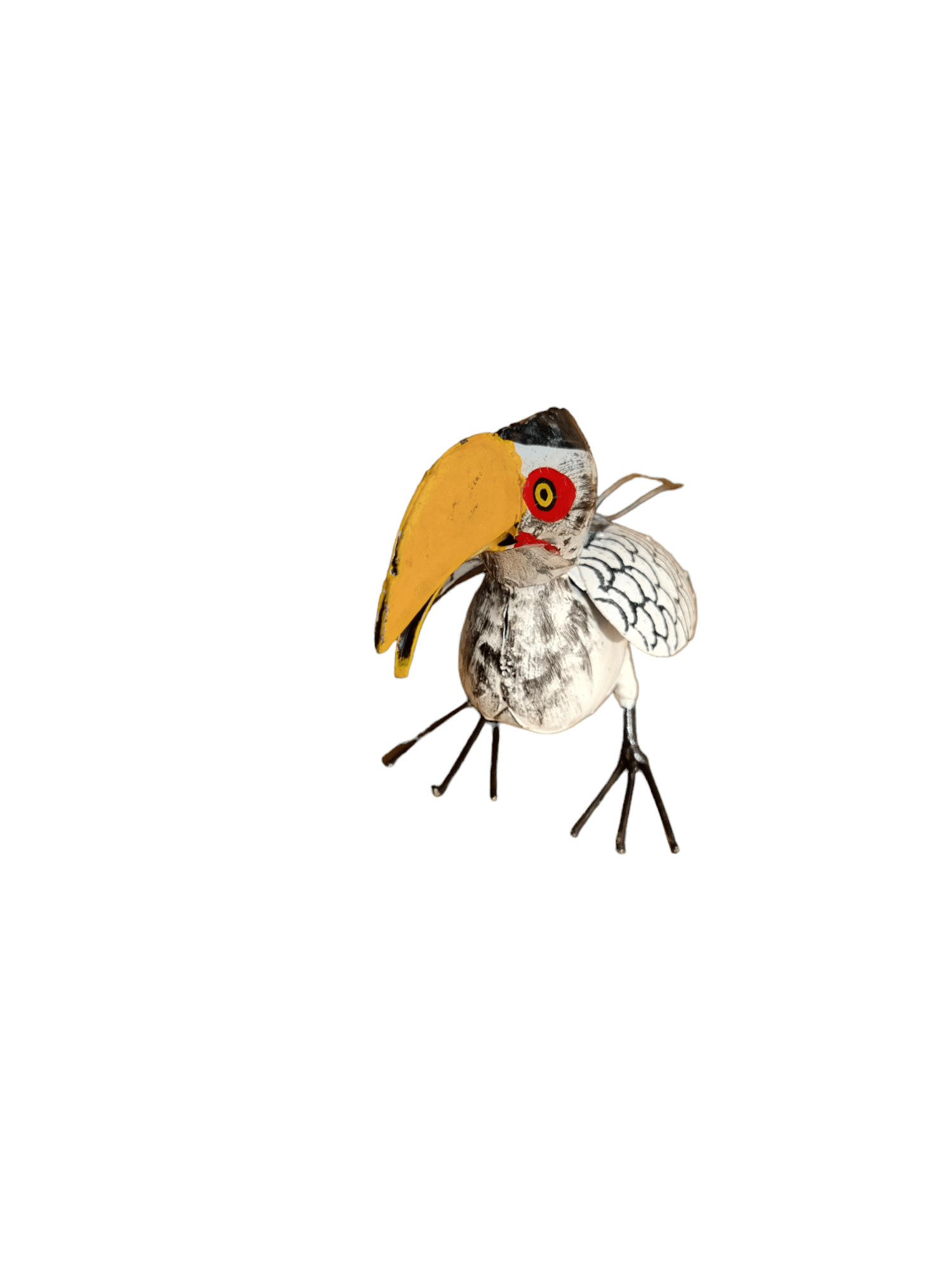 Deze handgemaakte metalen neushoornvogel van 32 cm is een eerlijk Fairtrade product dat sfeer en karakter combineert. Het unieke ontwerp valt op door de grote gele snavel, de felrode accenten rond de ogen en de artistieke zwart-witte beschildering op het metalen lichaam. Een duurzaam en vrolijk decoratiestuk dat door zijn ambachtelijke uitstraling een bijzondere plek verdient in elk interieur.