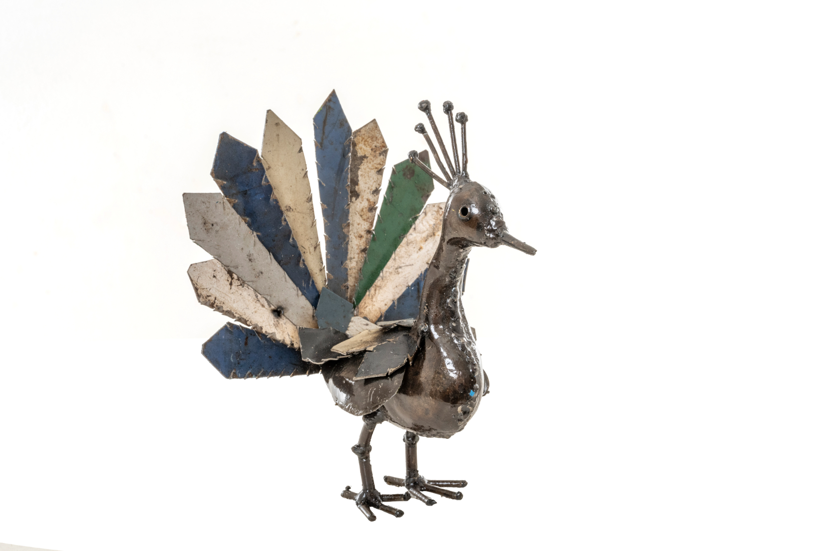 De pauw staat trots overeind en valt direct op door zijn waaierstaart. Deze is kunstzinnig opgebouwd uit verschillende stroken metaal met gekartelde randen, waarbij restanten van de originele verflagen in wit, groen en blauw zorgen voor een speels en levendig contrast. De robuuste lasnaden en de donkere, metalen body geven het geheel een rauw karakter, terwijl de parmantige kuif op de kop en de alerte houding het beeldje een sympathieke uitstraling geven.