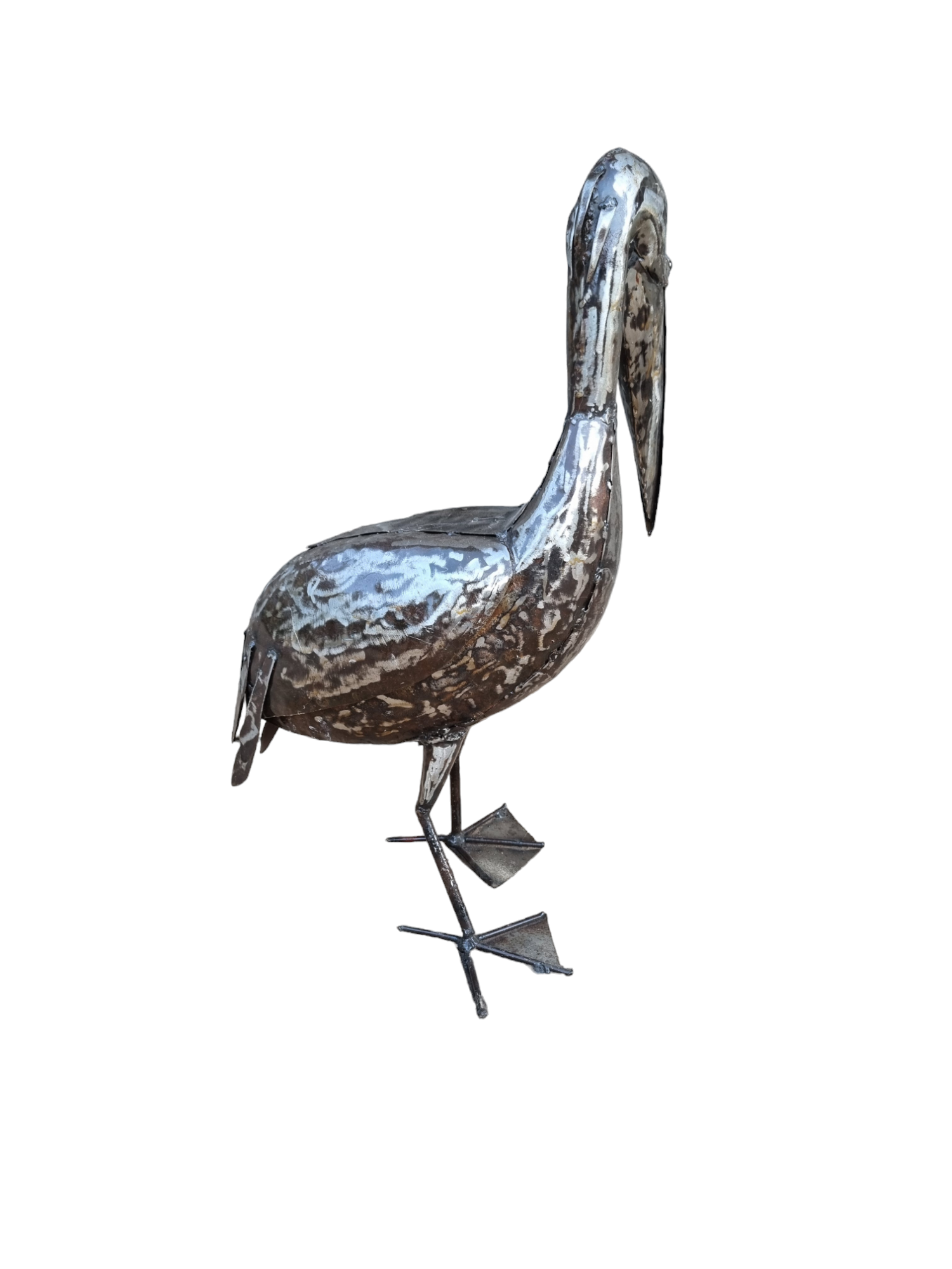 Het beeld kenmerkt zich door een rauwe, industriële uitstraling. De metalen platen zijn vakkundig aan elkaar gelast, waarbij de originele textuur en de zilverkleurige, soms wat verweerde finish van het metaal zichtbaar zijn gebleven. Dit geeft de pelikaan een robuust en authentiek karakter. De vogel staat stevig op zijn metalen vliezenpoten en kijkt met zijn lange snavel omlaag, een houding die typisch is voor deze watervogels. Omdat het materiaal bestand is tegen weer en wind (mits behandeld met een blanke lak voor langdurig buitenbehoud), is het een veelzijdig decoratiestuk.