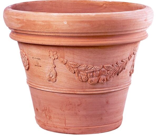 Deze dikke en degelijke handgedraaide terracotta pot heeft een bekende klassieke uitstraling. De middellandse zee regio bepaalt de uitstraling van deze ronde pot. Deze terracotta tuinvaas is gemaakt in de Italiaanse streek Toscane welke bekend staat om de unieke groen/bruine klei kleur en de zeer hoge kwaliteit hiervan. Deze klei verkleurt nadat het in de oven is geweest. Dit samen met het feit dat deze serie potten gebakken worden op de zeer hoge temperatuur van 1150gr C, maakt deze potten geschikt om vele jaren buiten te staan. De Doppio bordo festonato lijn kenmerkt zich door zijn brede bovenrand en zijn rijkelijke versiering op het oppervlak van de pot.
