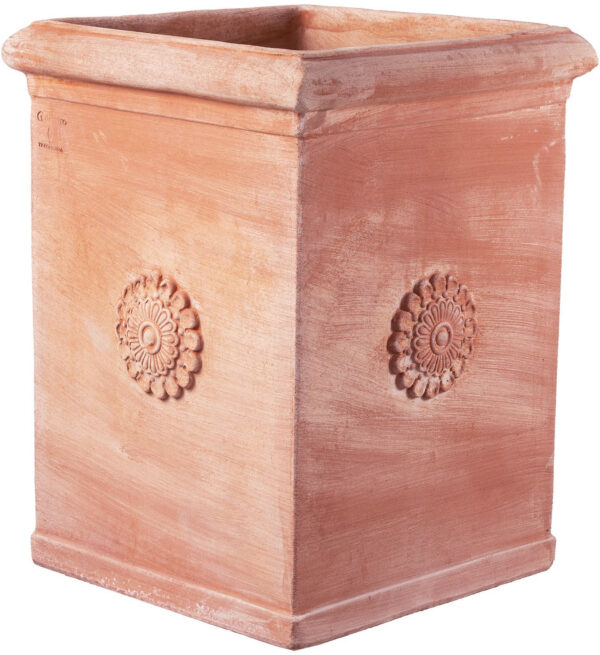 Deze dikke en degelijke handgemaakte terracotta pot heeft een bekende klassieke uitstraling. De middellandse zee regio bepaalt de uitstraling van deze vierkante pot. Deze terracotta pot is gemaakt in de Italiaanse streek Toscane welke bekend staat om de unieke groen/bruine klei kleur en de zeer hoge kwaliteit hiervan. Deze klei verkleurt nadat het in de oven is geweest. Dit samen met het feit dat deze serie potten gebakken worden op de zeer hoge temperatuur van 1150gr C, maakt deze potten geschikt om vele jaren buiten te staan. De Vierkante liscio rosone lijn kenmerkt zich door zijn brede bovenrand en zijn gladde oppervlak met in het midden een subtiele roos.