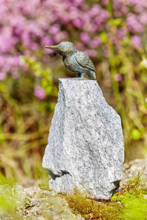 Mooi beeldje van een ijsvogel van hoogwaardig brons, op een hoge brok graniet uit het zwarte woud. Dit brons is van hoogwaardige Europese kwaliteit, met een minimale kopergehalte van 75% waardoor een zeer lange levensduur gegarandeerd is. Omdat dit een natuurproduct is, wijkt de vorm en kleur altijd af van de foto.