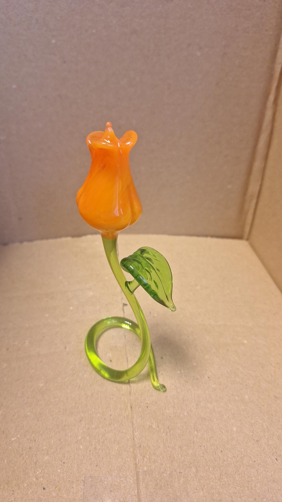 Bent u een liefhebber van glazen voorwerpen?, dan zult U deze oranje gekleurde roos ook wel mooi vinden.