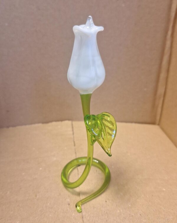 Bent u een liefhebber van glazen voorwerpen?, dan zult U deze wit gekleurde roos ook wel mooi vinden.