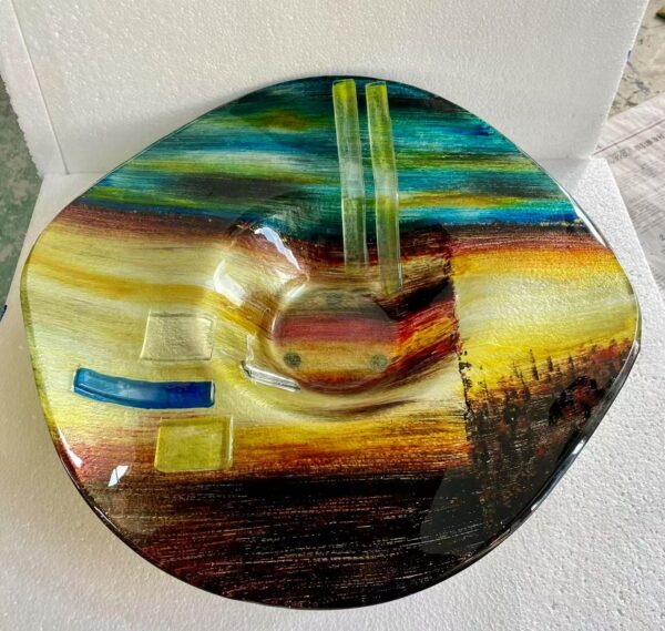 Dit model glasschaal is een geschikt model als u op zoek bent naar een spetterende en kleurrijke toevoeging in uw huis met moderne stijl en klasse. Ook voor op kantoor zorgt dit product voor een échte eyecatcher omdat deze schaal uniek is in zijn soort en kleuren in New Age stijl.
