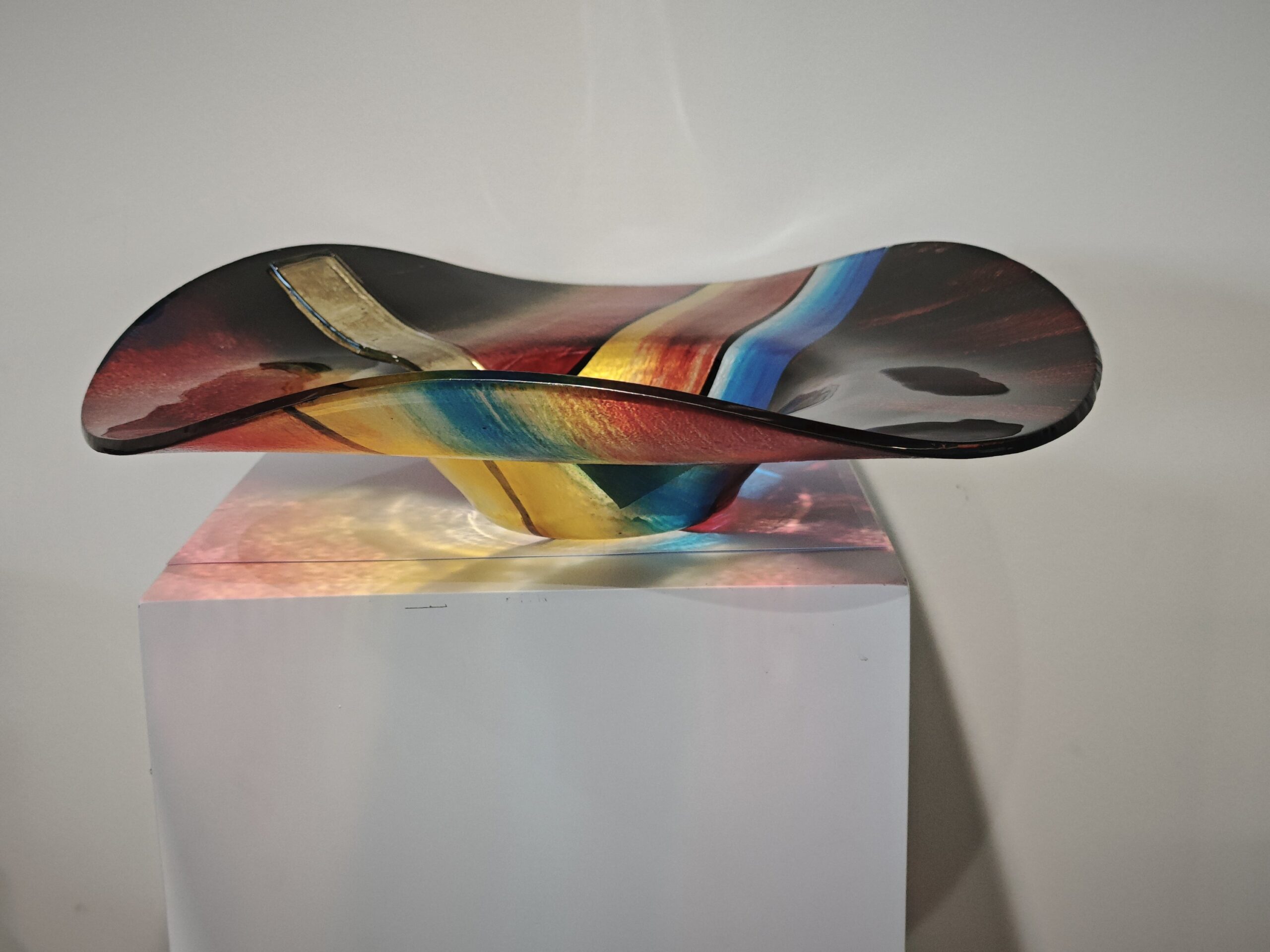 Dit model glasschaal is een geschikt model als u op zoek bent naar een spetterende en kleurrijke toevoeging in uw huis met moderne stijl en klasse. Ook voor op kantoor zorgt dit product voor een échte eyecatcher omdat deze schaal uniek is in zijn soort en kleuren in New Age stijl.