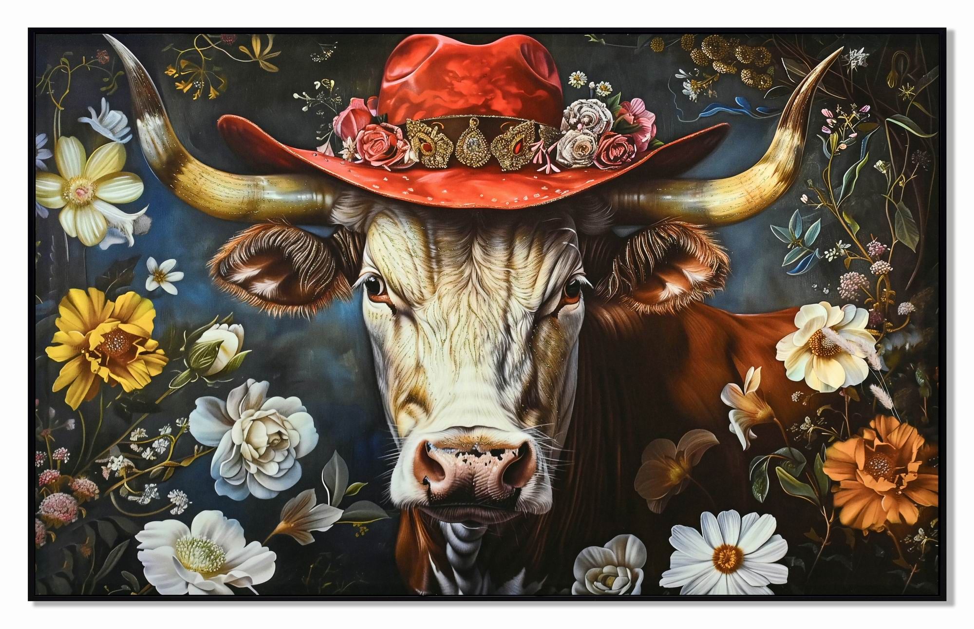 Bent u op zoek naar een hypermodern canvas schilderij met verschillende goud accenten? Dan is dit model hoogglans met glittereffecten schilderij met een koe met rode hoed op zeker iets voor u. Dit brede canvas schilderij heeft zeer mooie accenten met glitters op de kop van de koe, is zorgvuldig gemaakt met de mooiste kleurcomposities en met veel aandacht voor de finishing touch!