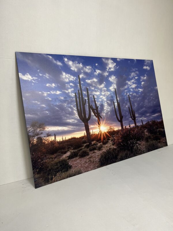 Wilt u een prachtig scherp schilderij met de afbeelding van een arizona desert maar u vindt glas te veel glanzen? Dan is deze serie schilderijen een goed alternatief. Dit schilderij is gemaakt van een glad paneel mdf, waarop deze afbeelding haarscherp is afgebeeld, in een mooie zijdeglans uitstraling. Van spiegeling heeft u met dit type schilderij geen last. Aan de achterzijde is dit schilderij versterkt met een 15mm dik mdf kader.