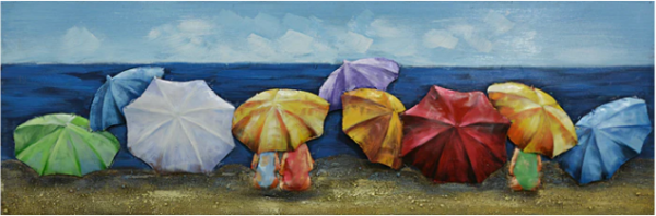 Mooi wordt uw huis, bedrijf of veranda (onder een afdak dus) met een dit stuk muurdecoratie. Dit model schilderij met parasols, is helemaal met de hand gemaakt. Alles van deze wanddecoratie is van metaal, achtergrond en figuur dus. Omdat het handgeschilderd en gemaakt is, kan de kleur iets afwijken van de foto, ze zijn nooit precies hezelfde. Op deze een beetje ruig gemaakte schilderijen kunnen altijd nog verder kleine afwijking zitten, soms is dat zelfs express gedaan om de stoere sfeer te bewerkstelliggen.