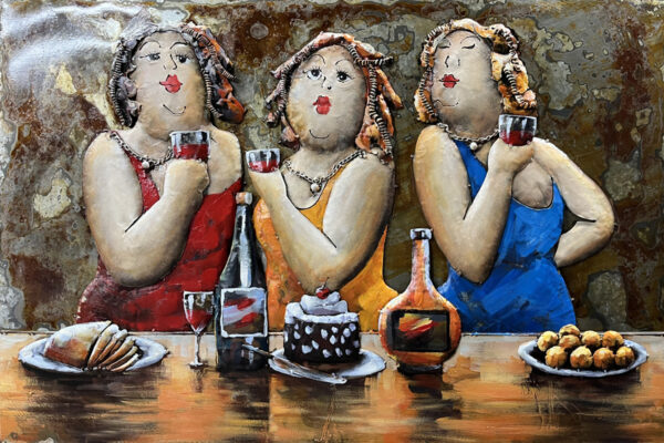 Handgeschilderd 3d metalen schilderij van een drietal dames aan de borrel. Afmeting 120x80cm hoog.