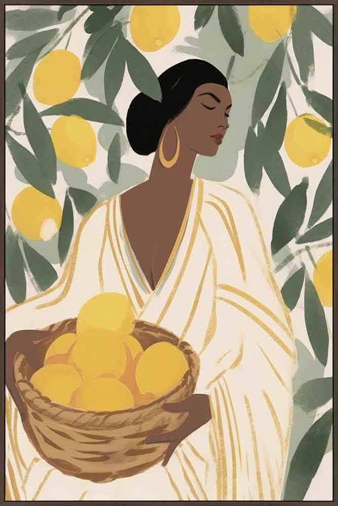 Bent u op zoek naar een mooi canvas schilderij bewerkt met acrylverf? Dan is deze serie wanddecoraties zeker iets voor u. Dit grote schilderij met de afbeelding van een mooie vrouw met een mand citroenen op een lichte achtergrond, is zorgvuldig gemaakt met de mooiste kleurcomposities en met veel aandacht voor de finishing touch!