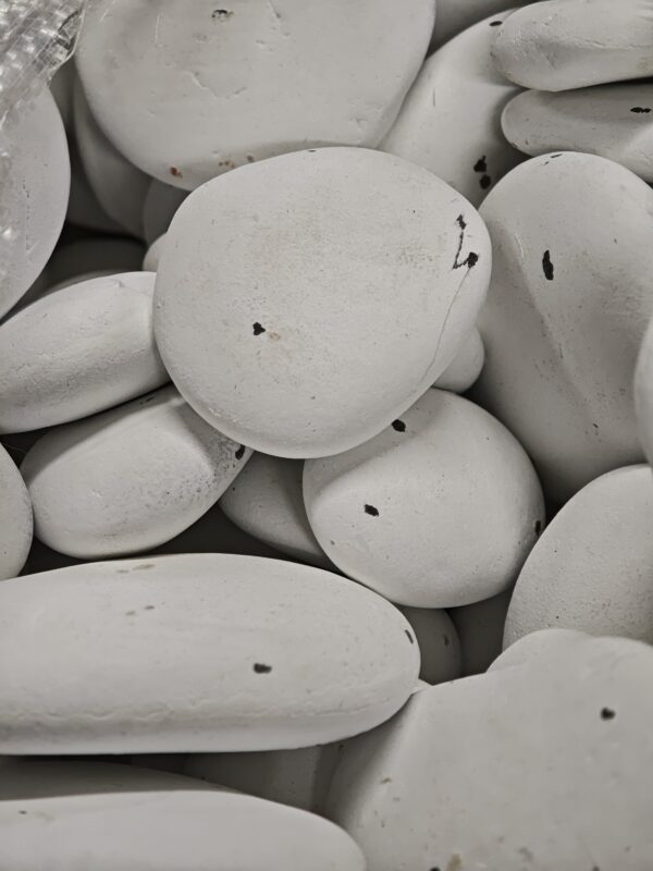 Zak met 20 kg wit geverfde platte keien, mooi glad en plat.